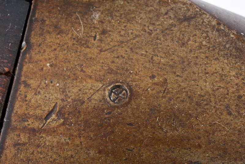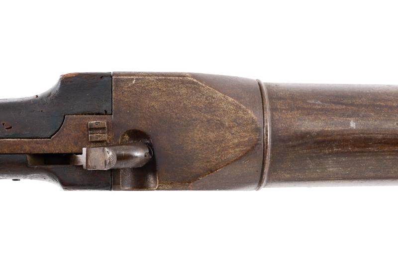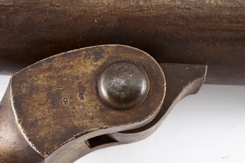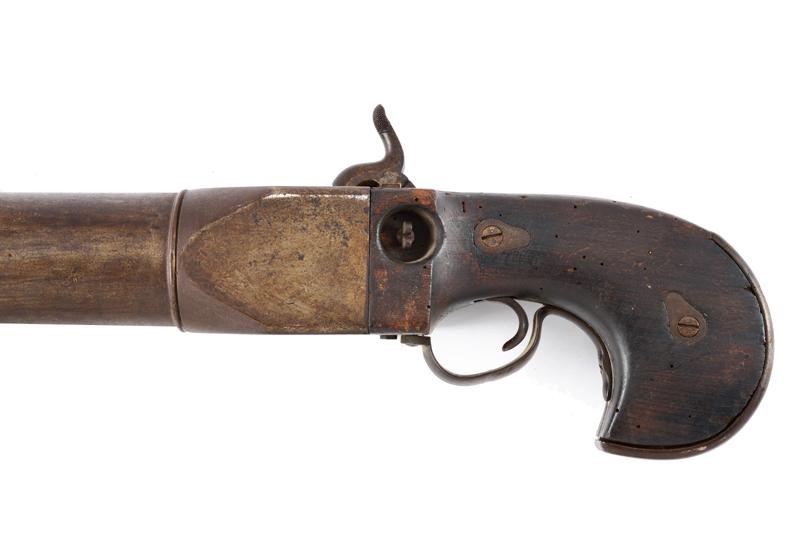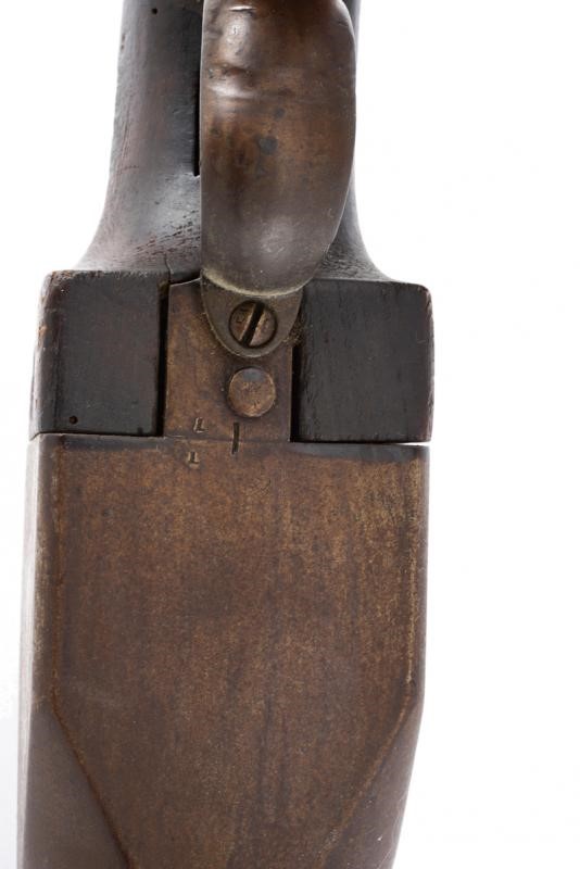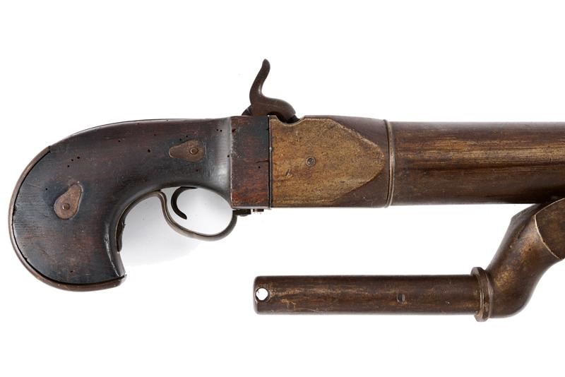 Heavy, smoothbore, iron, 40 mm cal. barrel of almost cylindrical shape, with moulded muzzle and with small foresight. Large breech shaped as a parallelepiped. Mechanism integrated in the grip. Rear hammer slightly off-centre to the right. Working mechanism. The wooden grip (a few woodworm holes) reinforced with iron. Iron trigger guard. Complete with its fork with mounting pin. For post use, probably to be mounted on the bulwarks of a vessel or for similar purposes. Rare and interesting type.
