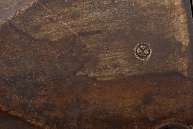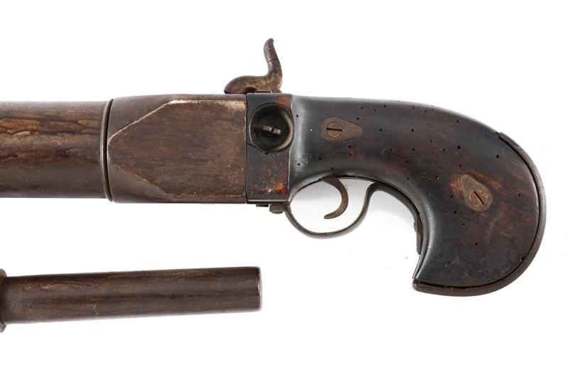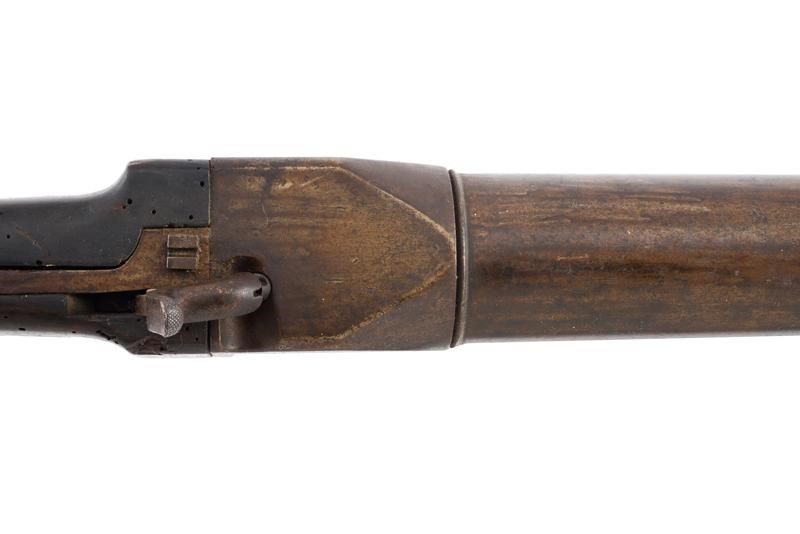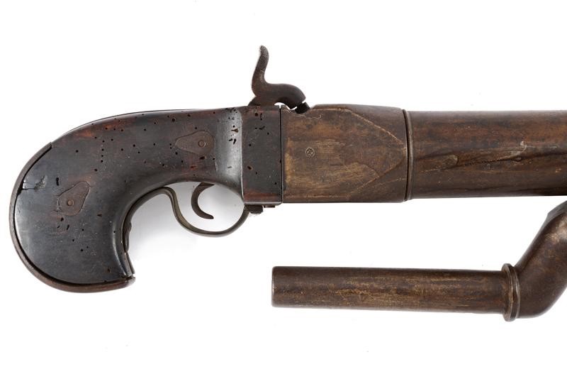 Heavy, smoothbore, iron, 40 mm cal. barrel of almost cylindrical shape, provided with moulded muzzle with small foresight. Large breech shaped as a parallelepiped. Mechanism integrated in the grip. Rear trigger slightly off-centre to the right. Working mechanism. Wooden grip (various woodworm holes) reinforced with iron. Iron trigger guard. Complete with its fork with mounting pin. For post use, probably to be mounted on the bulwarks of a vessel or for similar purposes. Rare and interesting type.