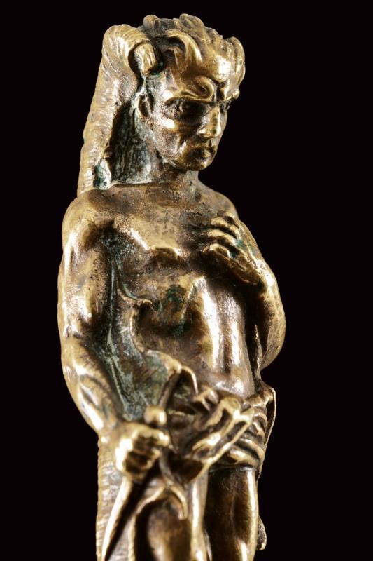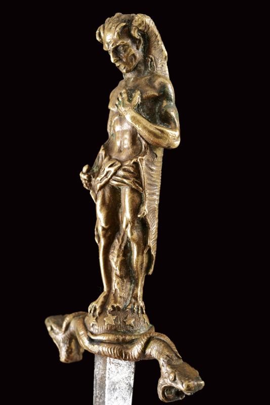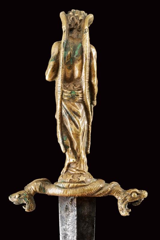 Straight blade of diamond section, bronze hilt with horned figure holding a dagger, resting on a dome decorated with stars and quillon shaped as snakes. Leather scabbard with mounts decorated in relief.