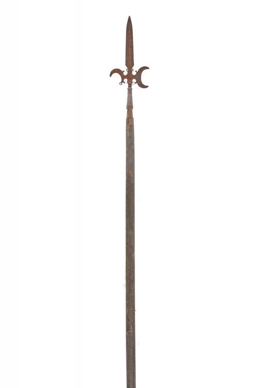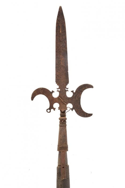 Spearhead with cusp-blade, axe shaped as a half moon, strongly curved rear fluke with open-works. Ferrule shaped as a truncated cone with several rings and remains of a strap. On wooden shaft (woodworm holes) not relevant, later production.