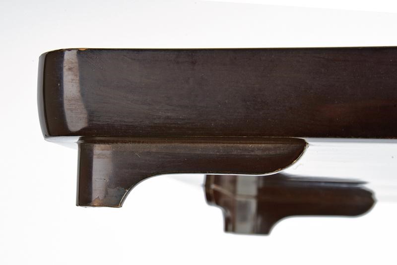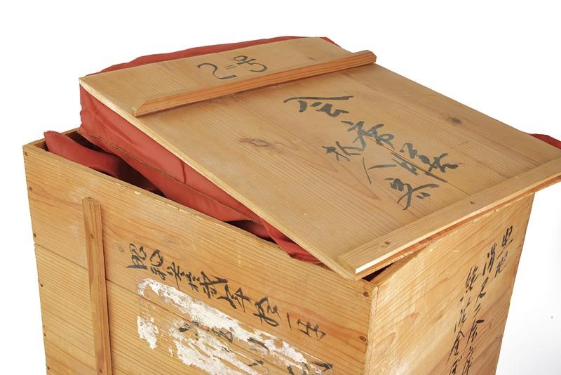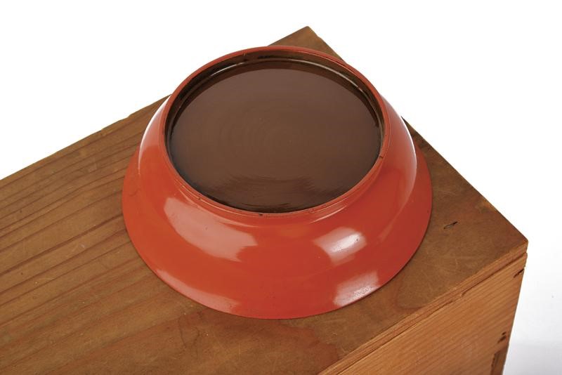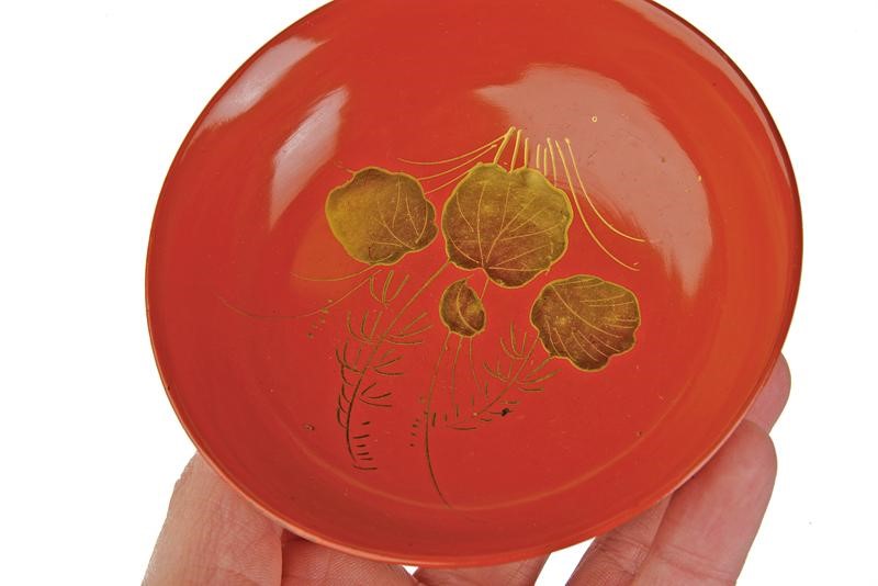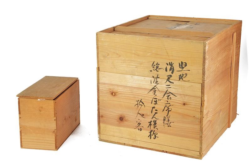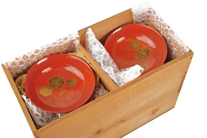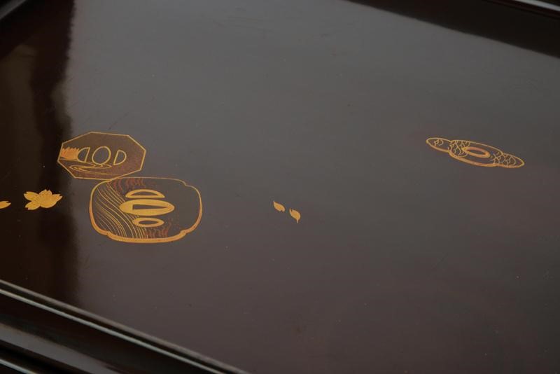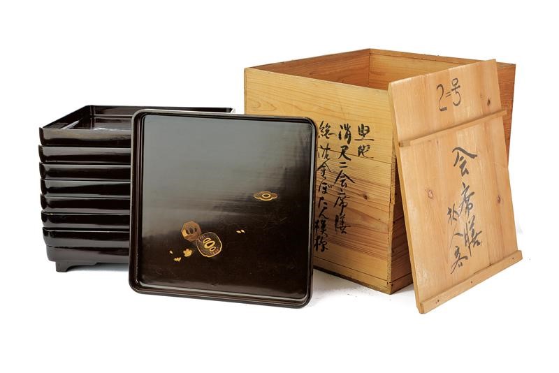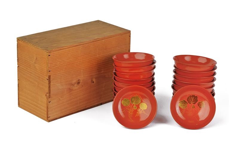 The wooden trays are square with round corners and four small feet. Lacquered black with tsuba and cherry blossom in Makie motif. Together with 18 round, convex, light-red lacquered wooden cups with Kiri-paulownia motif in gold. Signs of time and use. Both trays and cups are in their original wooden boxes. The motifs of trays and cups are different but come from the same family.