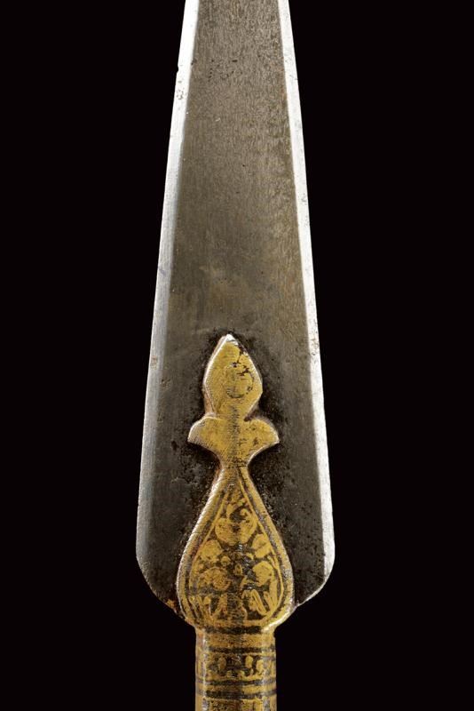 Knife with wide, damascened blade, with hollow tip and carving at the girdle, with gold decorations at the base. Iron grip, with angled pommel, engraved and gilded with floral motifs. Spearhead with double-edged blade, faceted ferrule shaped as truncated cone and gilded with floral motifs. Together kept in an octagonal, wooden box with lid, painted in polychromy with hunter on a horse chasing a dragon, hunting scenes, figures and animals on the sides.