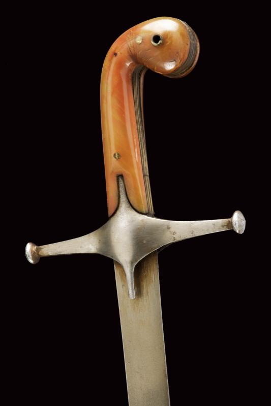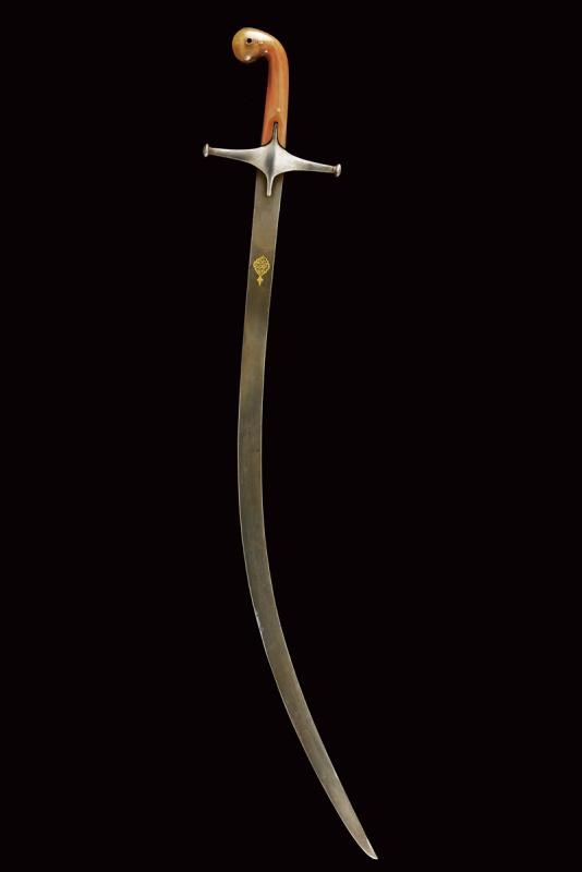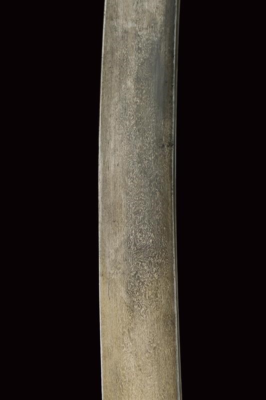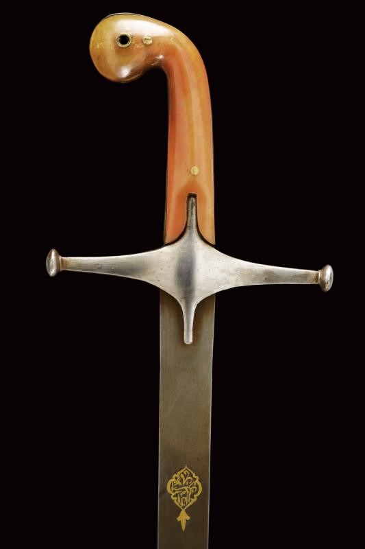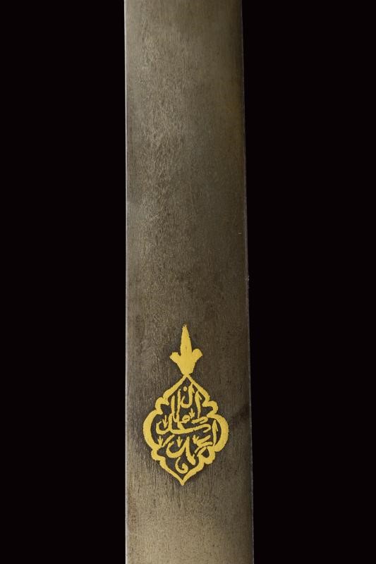 Curved, flat, single-edged blade, made of fine damask, on the right side a cartouche in gold on a dark background bearing inscriptions in Arabic. Iron hilt with cross quillon and grip with horn grips and angled pommel. The central band made of brass.