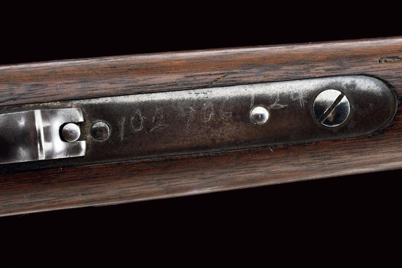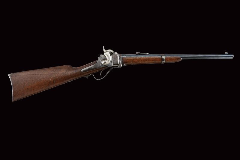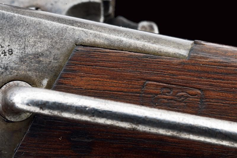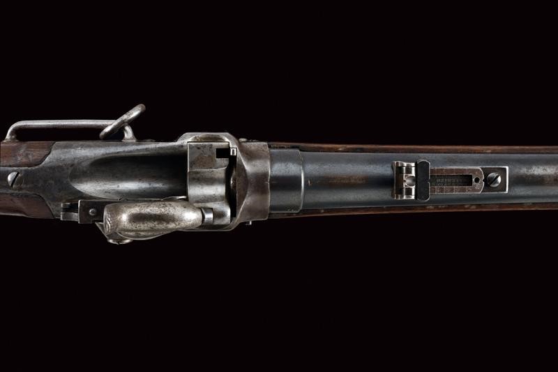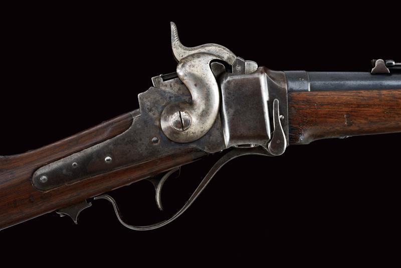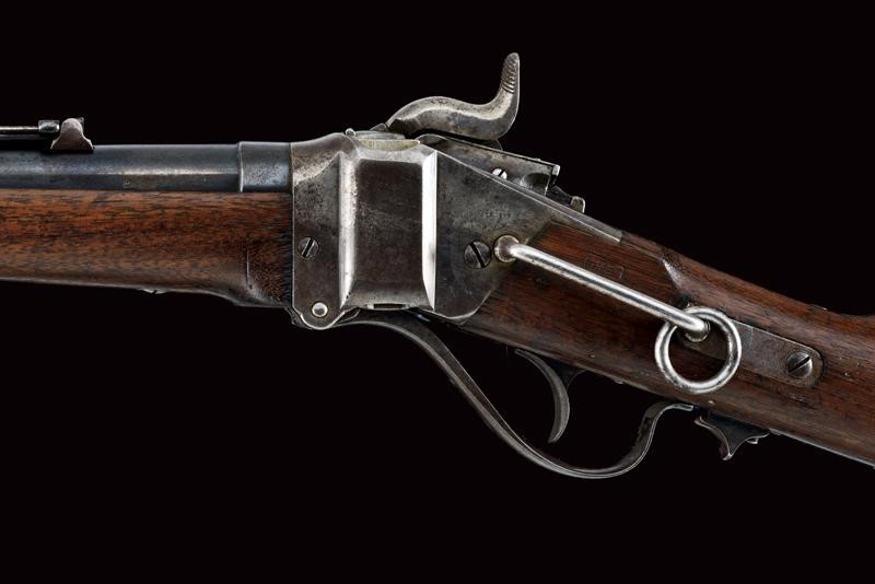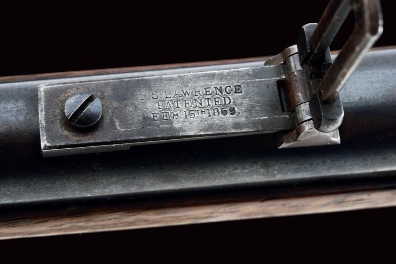 Round, rifled, 50 cal. barrel, with foresight and adjustable rear sight, marked at the base with Lawrence's patent of 1859 and "NEW MODEL 1863". Iron frame with remains of a mark on the counterplate with Sharp's 1848 patent. Bolt with lever opening (mark "F"). Working mechanism. Smooth wooden butt and fore-end (signs of use); the counterplate with saddle bar and a ring; iron butt plate. Without serial number.