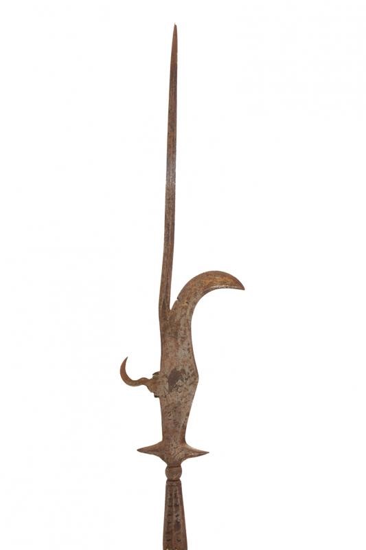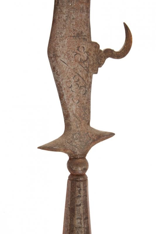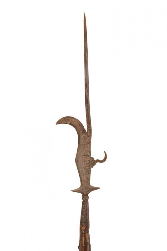 Spearhead with cusp of square section, hooked back spike and two stops at the base. Surface with remains of engravings. Ferrule with short straps. Wooden shaft (restorations), probably later.