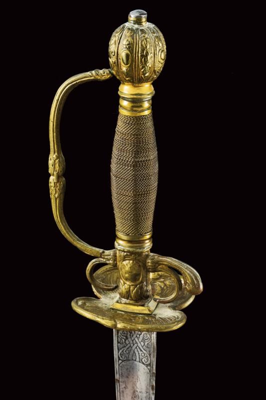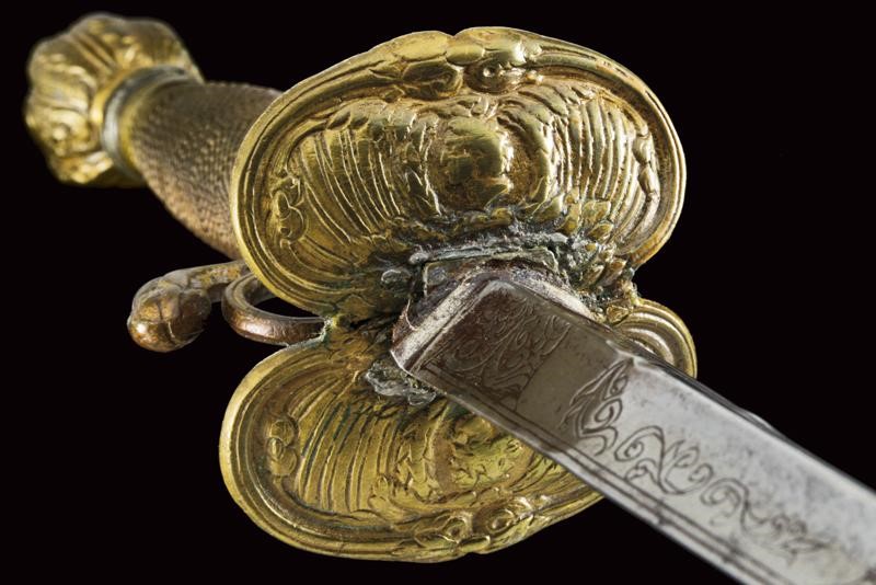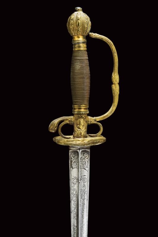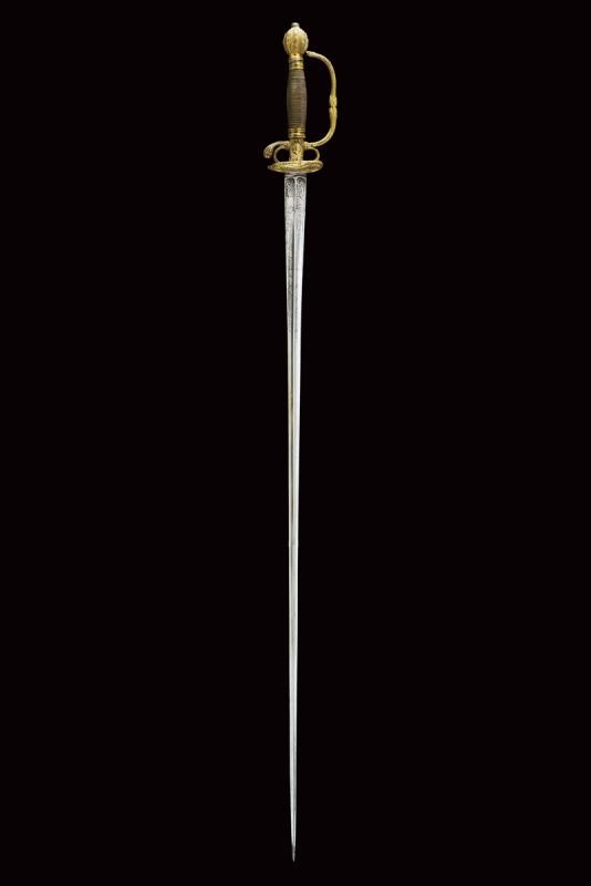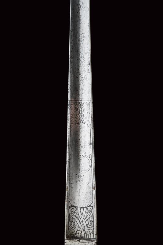Straight blade of triangular section with hollow faces, the first part finely engraved with floral motifs. Brass hilt decorated with busts and floral motifs in bas-relief. Wooden grip covered with metal wire binding.