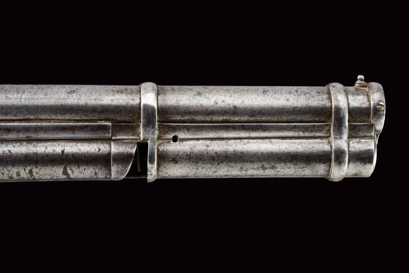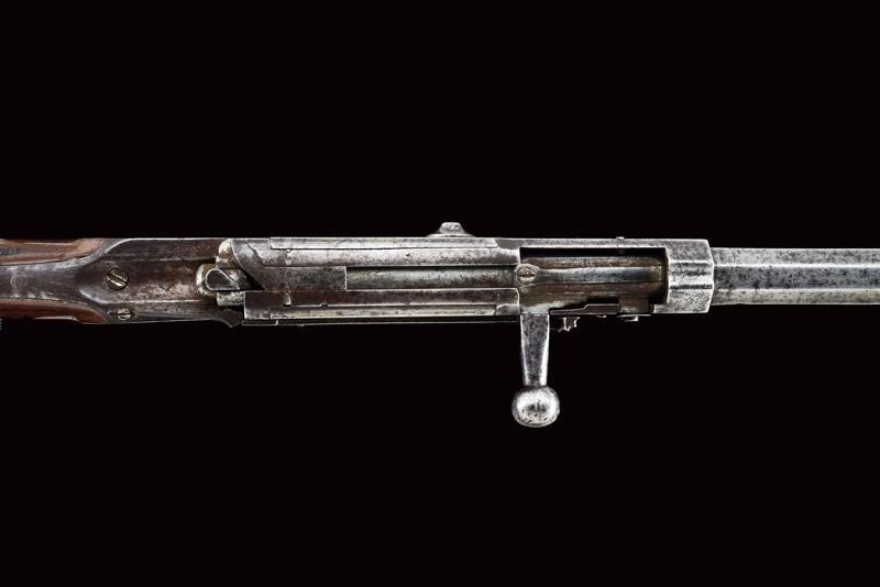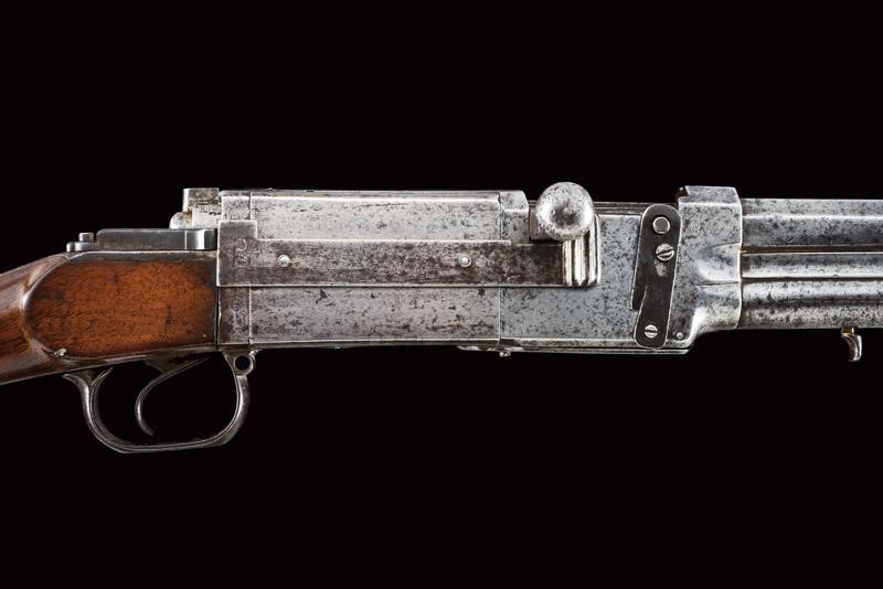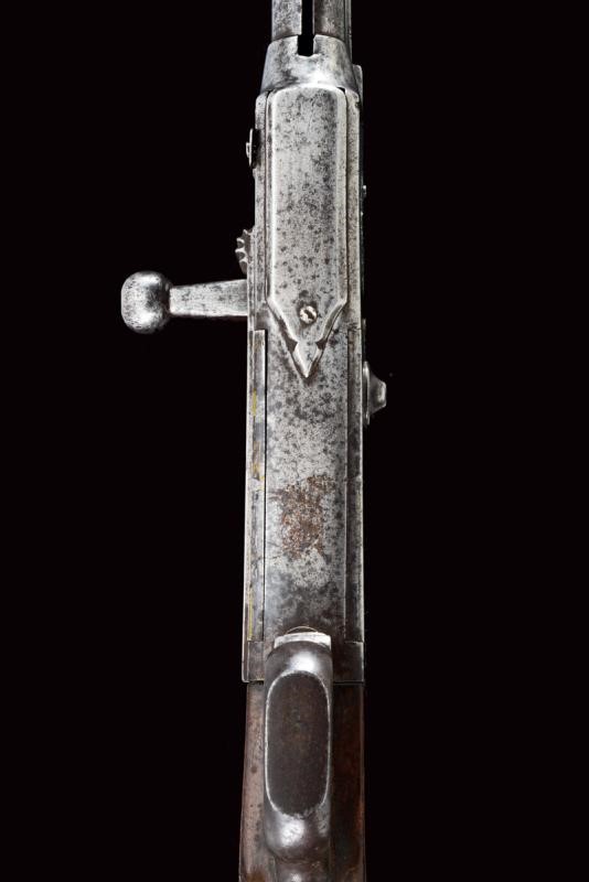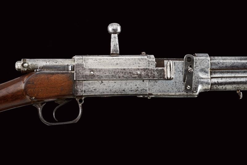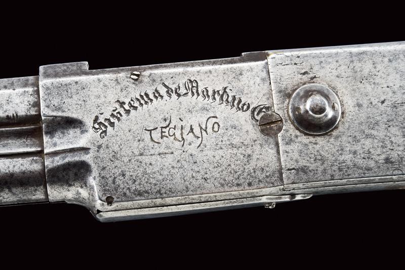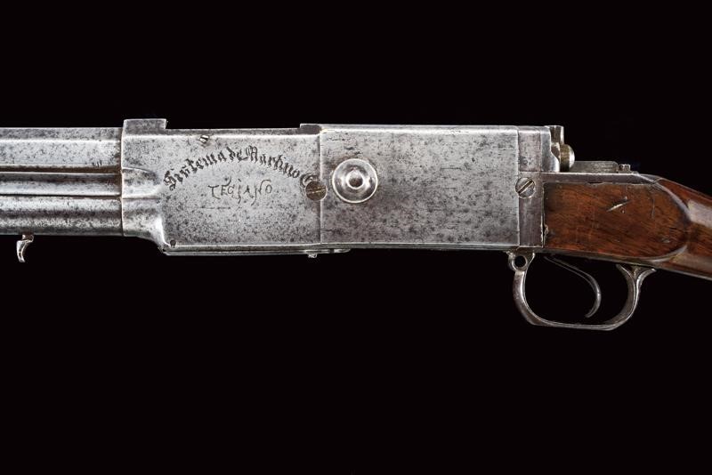 Smoothbore, two-stage, 17 mm cal. barrel, octagonal at the first part and then round, with front sight. With a very long magazine under the barrel, similar to those of the Venditti pistol or the Henry gun. Long frame with Mauser type, iron bolt, marked "Sistema de Martino Tegiano" on the left side. Wooden butt with iron mounts. See an article on this interesting repeating gun in "Diana Armi" of January 1st, 1988, Editoriale Olimpia SpA, pages 70-73 where the weapon is described and compared with the Venditti system.