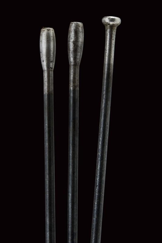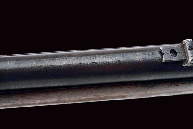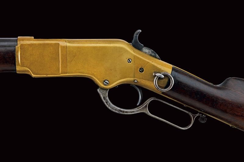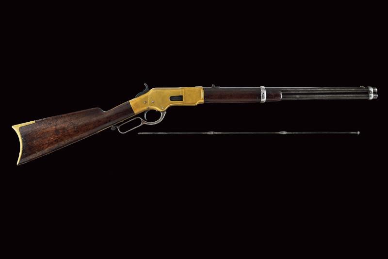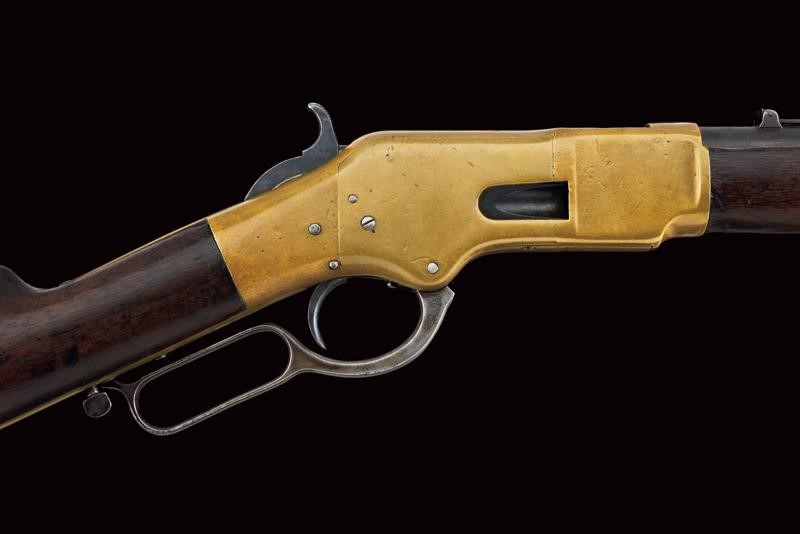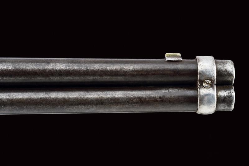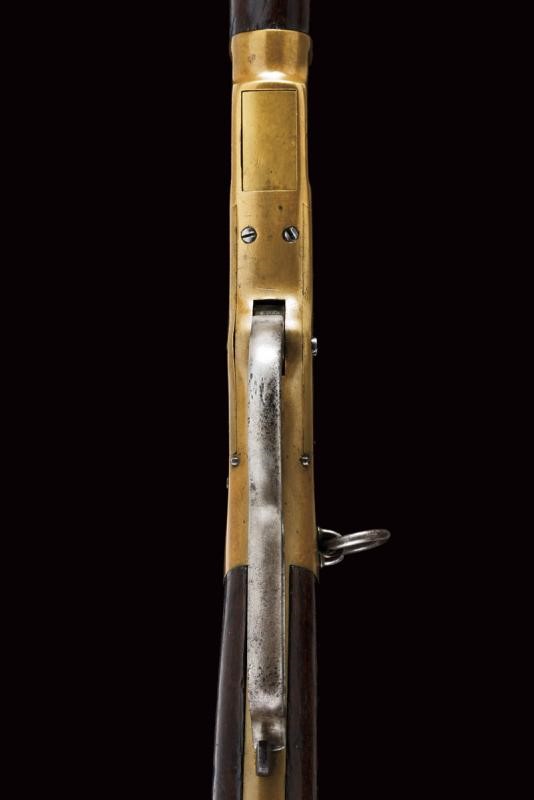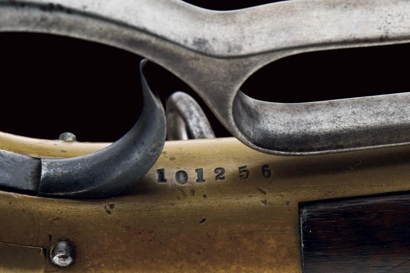 Round, rifled (visible rifling, light pitting), 44 centerfire cal barrel marked with address and patent, provided with rear sight and front sight. Brass frame, serial number "101xxx", mark "BP" and another one (barely legible) behind the lever. Wooden butt (some pitting) with brass mounts. Trigger guard with unstable lever. Provided with a very rare, three-piece, iron ramrod in the butt. Saddle ring. Working mechanism. Rare.