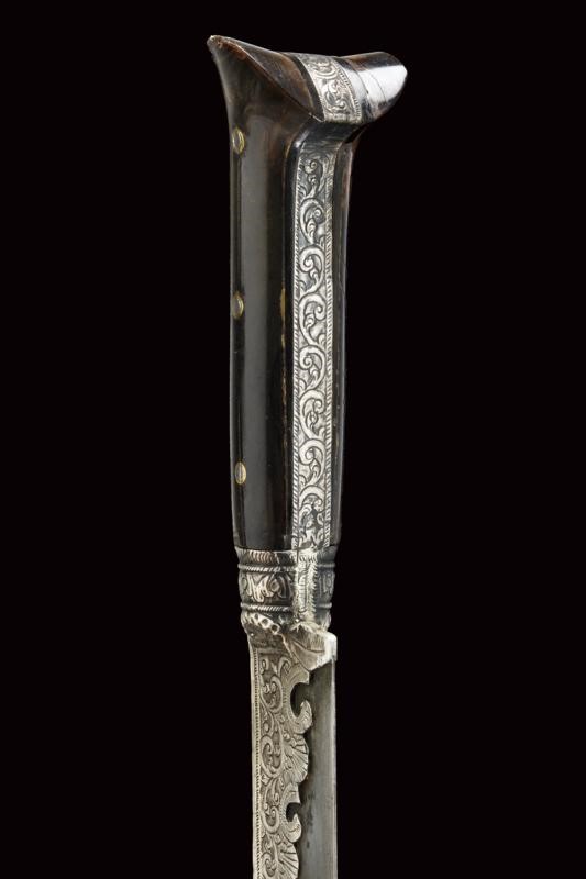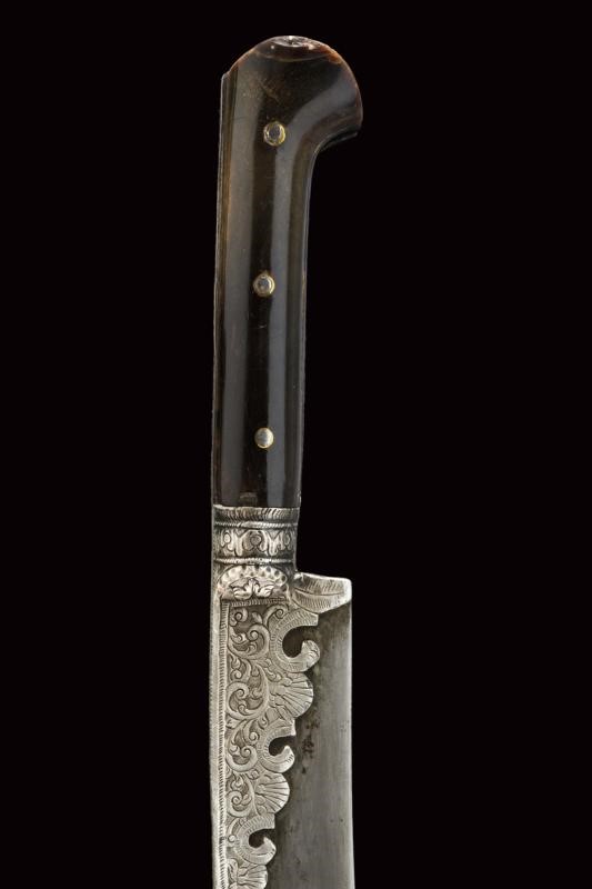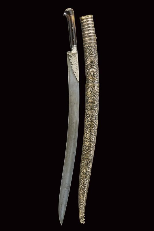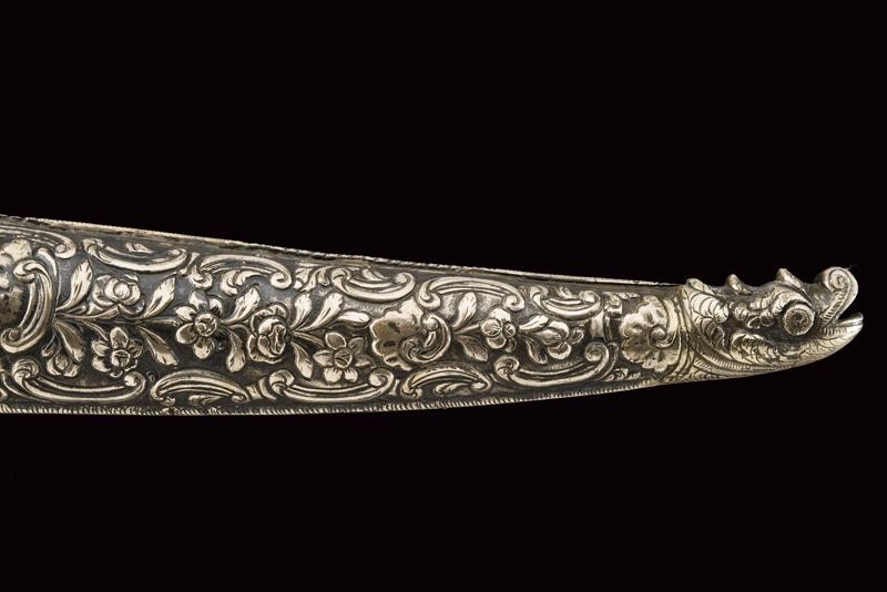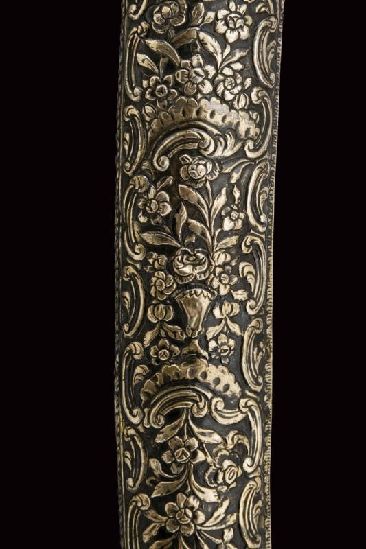 Slightly curved, single-edged blade, the base covered with silver foil engraved with floral motifs. Grip with carved horn grips (small missing parts), with central band of engraved silver. Wooden scabbard completely covered with silver foil richly embossed with cornucopias and floral motifs, the chape with monster's head, the cap with bands. Small suspension ring.