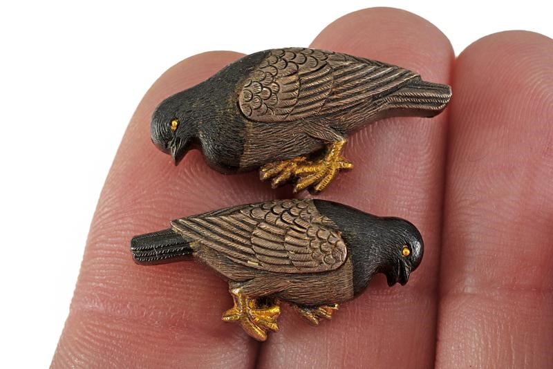 Made of silver, in relief and finely engraved, with finished tail and head, golden legs and eyes. Depicting a pair of pigeons (male and female). Fastening block and the inscription "Naohiro Nagata" at the back. In a kiri-box.