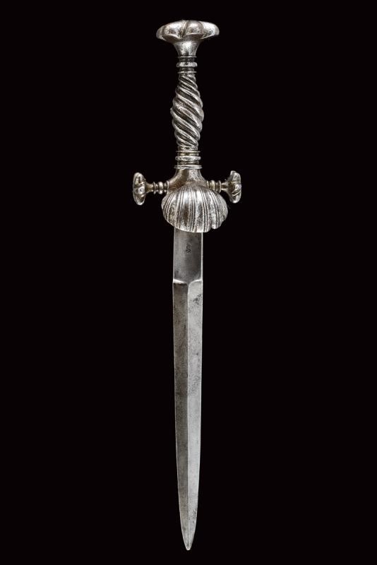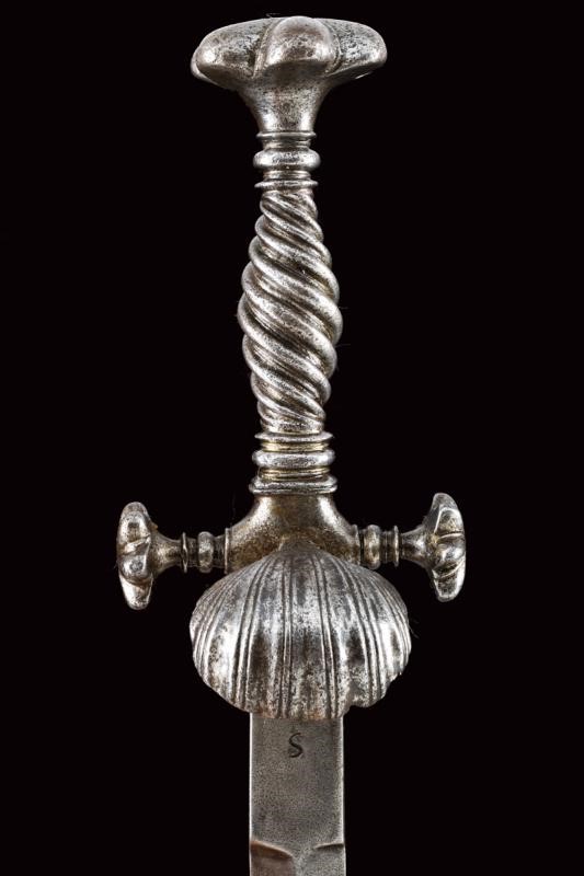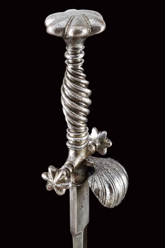 Straight, double-edged blade ribbed in the middle, long slightly convex tang with 'S' mark. Massive iron hilt carved with small valve on the center of crossbar. The two loop-guards of the baluster-shaped quillon with star-shaped ends, the large pommel worked en suite. Grip with spirals.