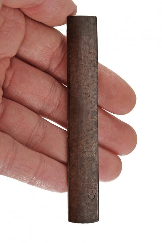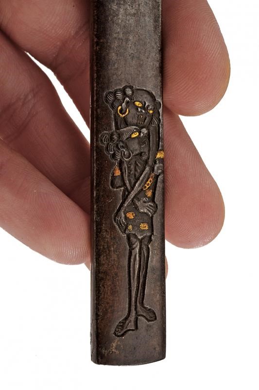 Made of ferrous metal. With the effigy of two carved figures and gilded elements. Peculiar, Southeast Asia-style iconography. An engraved ideogram at the back. Kept in kiri-box. Epoch: probably early Edo period, 17th century.