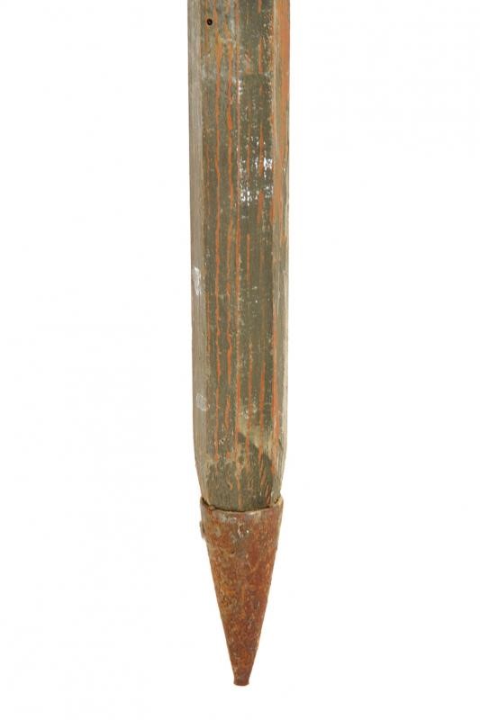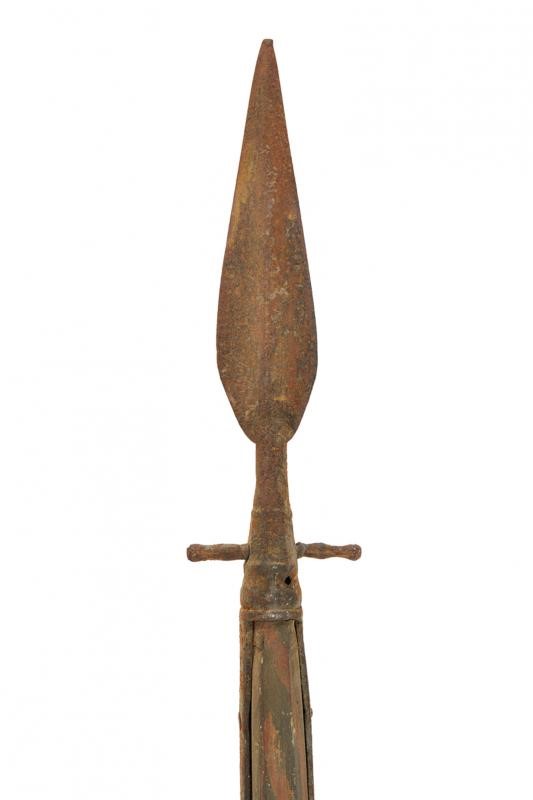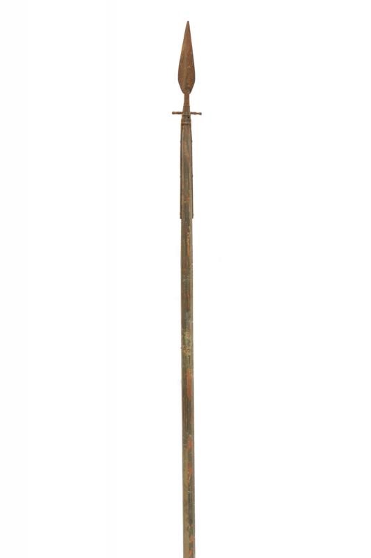 Double-edged cusp blade shaped as a leaf, the ferrule with two stops and provided with straps. On octagonal wooden shaft of non-recent production. Conical, iron shoe. In antique patina.