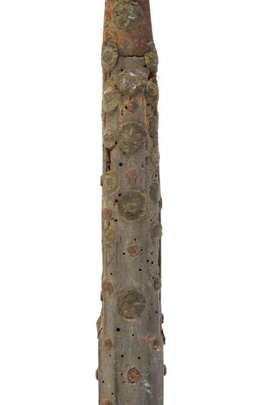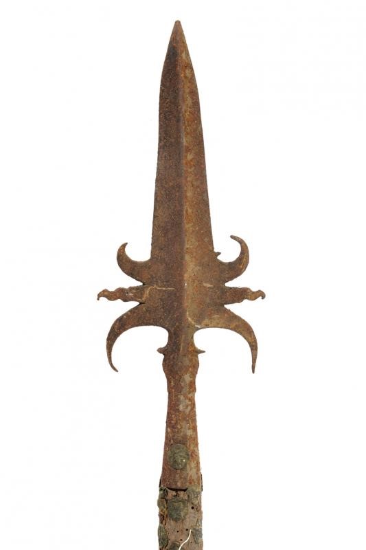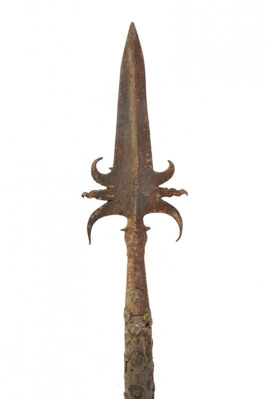 Spearhead with blade strongly ribbed in the centre provided with triple wings and a short ferrule. Wooden shaft of octagonal section, probably antique, with remains of studs and woodworm damage. In antique patina.