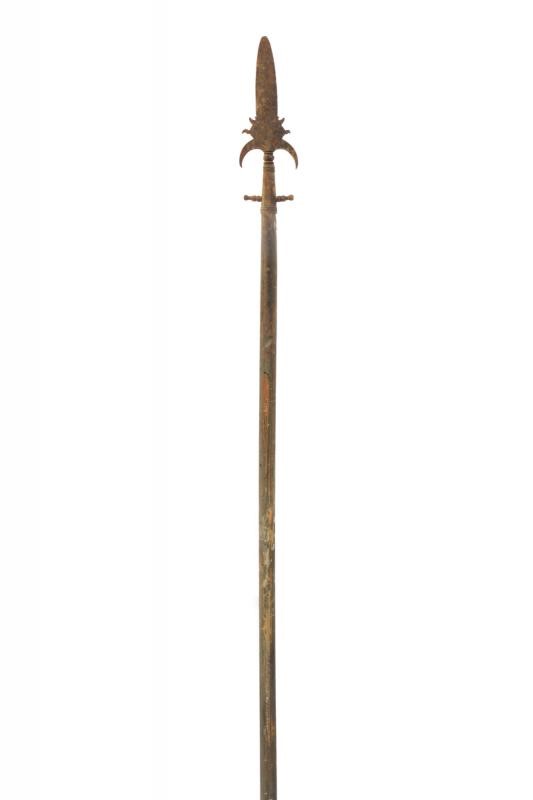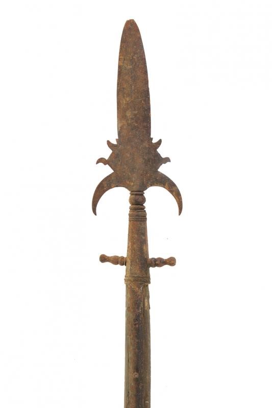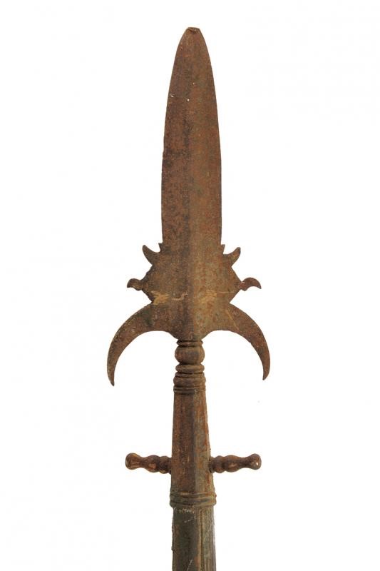Spearhead with cusp-blade (small missing part part at the tip), with triple wings. Ferrule with small knot, stops and straps. Cylindrical wooden shaft (woodworm damage) with iron shoe. In antique patina.