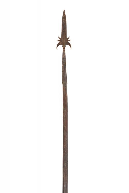 Spearhead with cusp-blade strongly ribbed in the centre and with triple wings at the base. Ferrule with knot and straps. On wooden shaft of not recent production (woodworm holes). In antique patina.