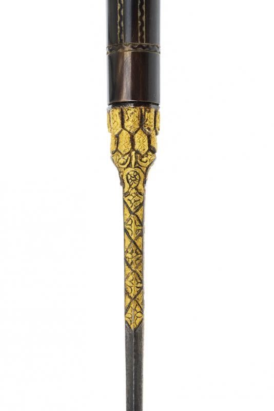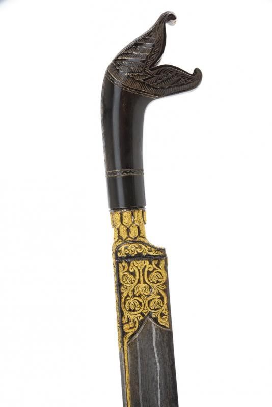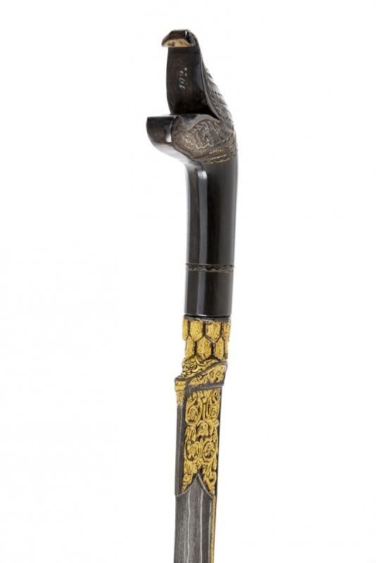 dating: End of 19th beginning of 20th Century provenance: Sumatra, Straight, single-and false-edged blade made of very fine dark pamor with light metal longitudinal lines. Carved with gilded floral motifs on background at the base and at the back. Horn grip, pommel carved with a stylized mouth and engraved with geometrical motifs, the base worked en suite with the blade and decorated with gilded scales. Wooden scabbard with engraved horn cap and engraved, silver-inlaid mounts. Number of collection '192'. Rare. length 39.7 cm.