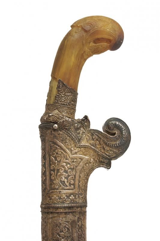 dating: Late 19th Century provenance: Sumbawa, Straight, single-edged, pamor blade. Silver ring nut decorated with racemes in relief (missing parts). Light horn grip, carved and pierced. Wooden scabbard completely covered with silver foil (small restoration), also this richly decorated with racemes in relief. Two loops. length 52 cm.