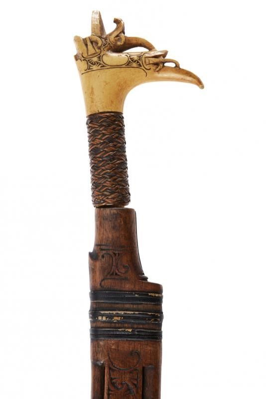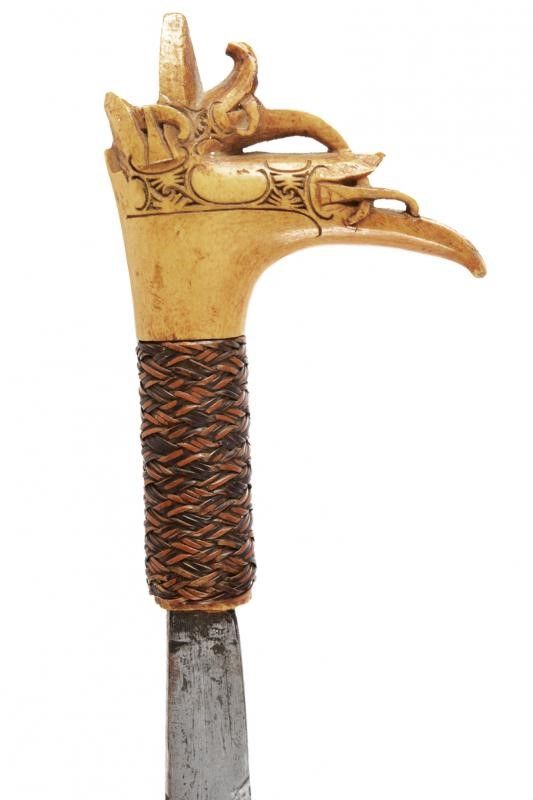dating: First half of the 20th Century provenance: Kalimantan, Single-edged blade with tang. Sculpted and bone hilt, base covered with vegetal fiber wire binding. Wooden scabbard partially sculpted and with vegetal fiber bands. length 53 cm.