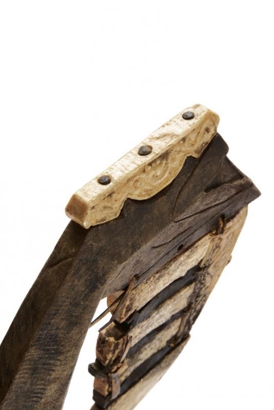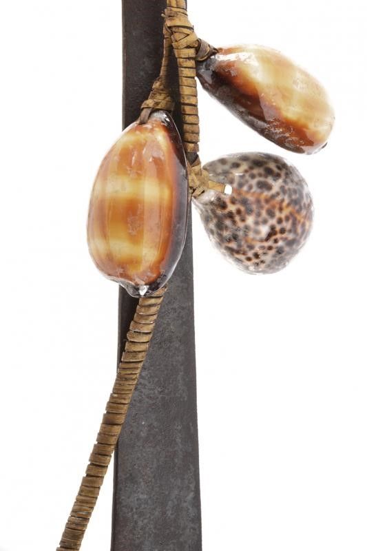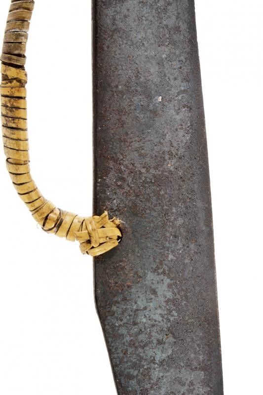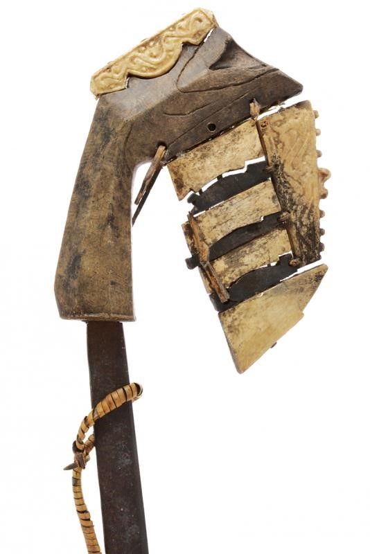 dating: 19th Century provenance: Tanimbar Islands, Long, single-edged blade enlarging towards the weak with hollow tip at the back, an opening for the fiber suspension rope at the girdle, decorated with three pendants. Wooden grip with angled pommel, decorated with partially engraved, bone plaques. Interesting and rare variation of a klewang. length 94.5 cm.
