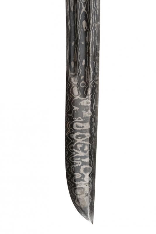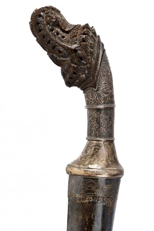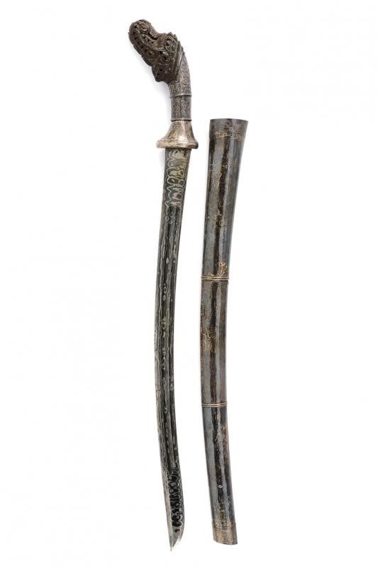 dating: 19th Century provenance: Palembang, Curved, single-edged blade with double groove, made of very fine pamor. Horn hilt with richly carved and pierced pommel, the base with three silver-inlaid mounts the upper ones engraved with floral motifs. Wooden scabbard completely covered with silver foil and engraved with floral motifs on the edges. length 74.5 cm.