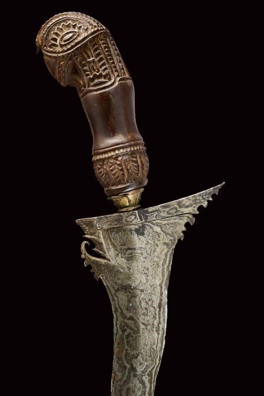 dating: 19th Century provenance: Madura Island, Undulated, double-edged blade made of fine pamor, carved base with light fuller; sculpted, wooden ukiran with pommel shaped as a stylized parrot's head, brass mendak decorated with filigree. Sculpted, wooden warangka with smooth gandar. length 47 cm.