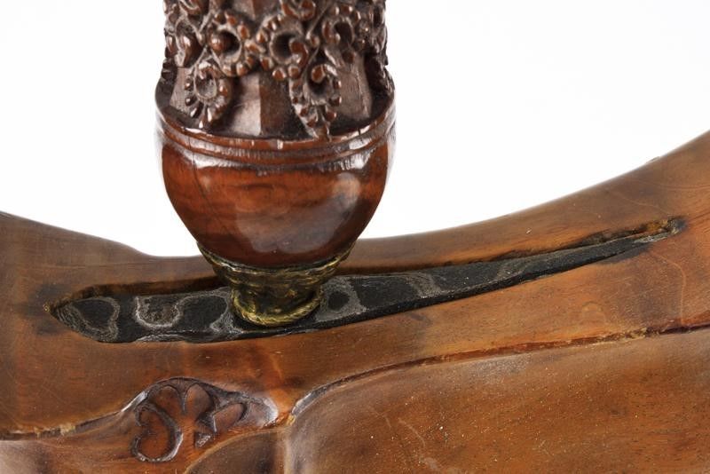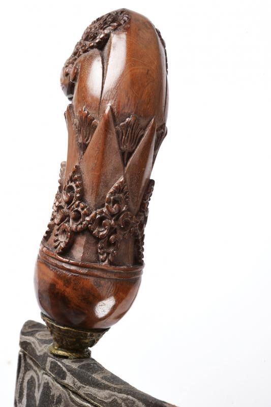dating: early 20th Century provenance: Madura Island, Almost straight, pamor blade. Brass mendak. Wooden ukiran carved with floral motifs. Wooden scabbard with white metal pendok. length 47 cm.