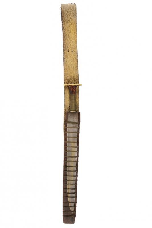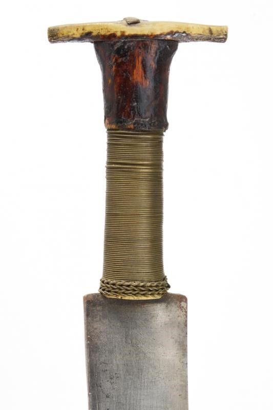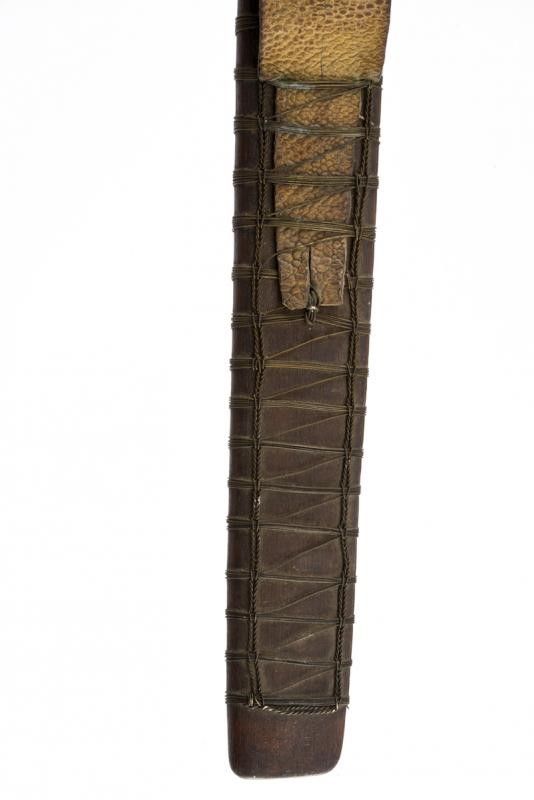 dating: 19th Century provenance: Luzon, Wide, straight, single-edged blade, wood and deer-horn hilt covered with metallic wire binding. Wooden scabbard open on one side and closed with a metallic grid. Complete with large, leather shoulder strap. length 51.3 cm.