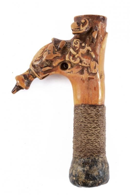 dating: 19th Century provenance: Kalimantan, Made of richly-sculpted, deer horn, covered with vegetal fiber at the base. height 14.8 cm.