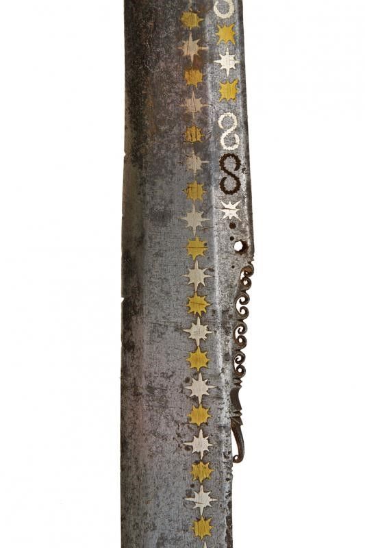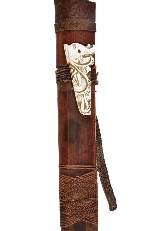 dating: 19th Century provenance: Kalimantan, Straight, single-edged blade, richly inlaid with silver/brass stars and symbols on a side, finely carved on the back near the weak. Sculpted, bone hilt, covered with vegetable fibre wire binding at the base. Complete of wooden scabbard, partially sculpted and decorated with an engraved bone plate and with vegetable fibre wire binding. Complete of intertwined suspension rope. length 63 cm.