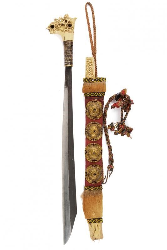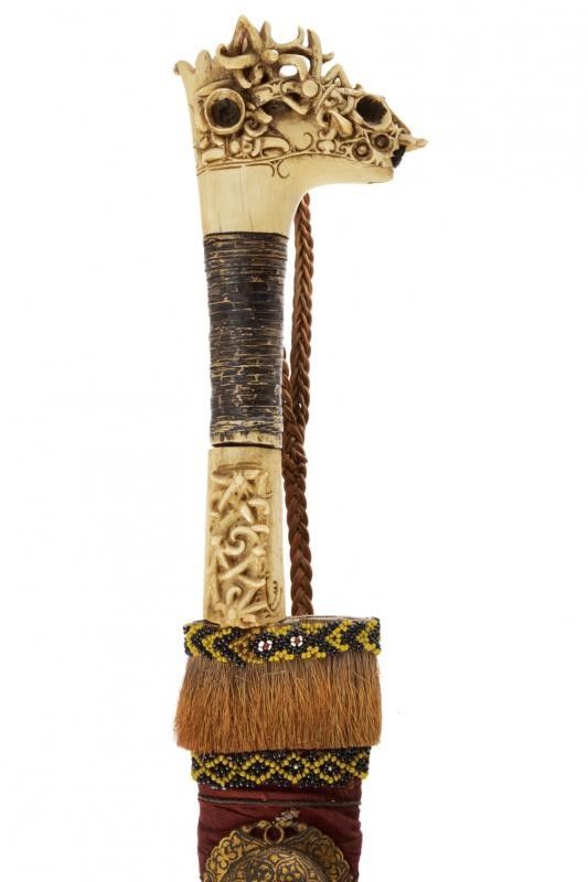 dating: End of 19th beginning of 20th Century provenance: Borneo, Solid, single-edged blade. Beautiful hilt made of richly carved and pierced deer horn, covered with vegetable fiber at the base. Beautiful, wooden scabbard covered with red fabric, sculpted deer horn cap, the edges with goat fur among bands made of colored glass beads, the center decorated with four, decorated, iron studs probably from an Indian shield. Complete with fiber and fabric wire binding with wooden closing button. Rare and unusual decoration of the scabbard. length 62 cm.