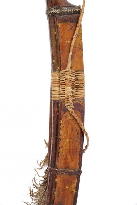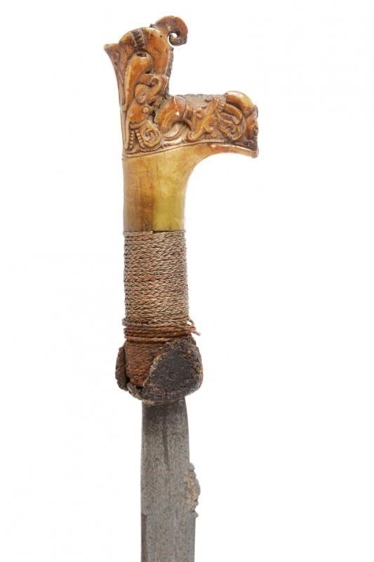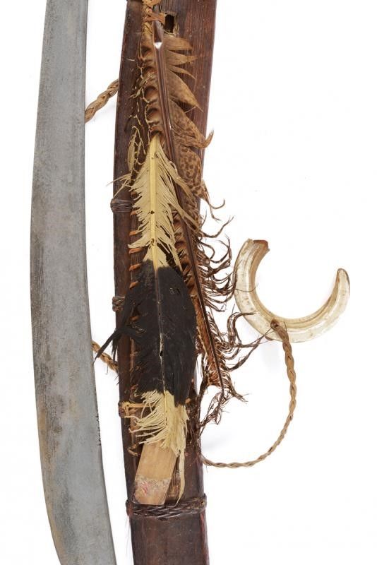 dating: 19th Century provenance: Borneo, Solid, curved (Langgai Tinggang shape), single-edged blade with a small, carved hump at the tang and small carvings at the back, near the weak. Finely carved, bone hilt, base covered with metallic and vegetal wire binding (missing parts). Partially-lacquered, wooden scabbard with stripes made of vegetal wire binding, metal band, the second scabbard (with no knife) decorated with two feathers, the vegetal rope with wild boar tooth. length 74 cm.