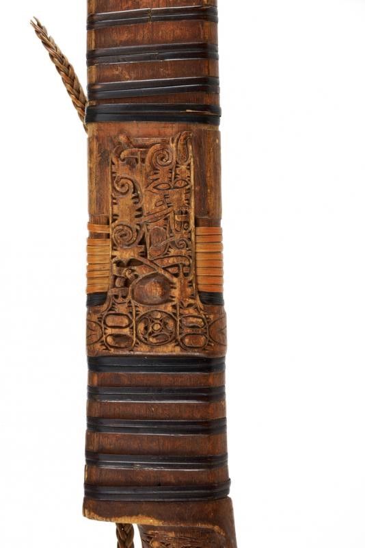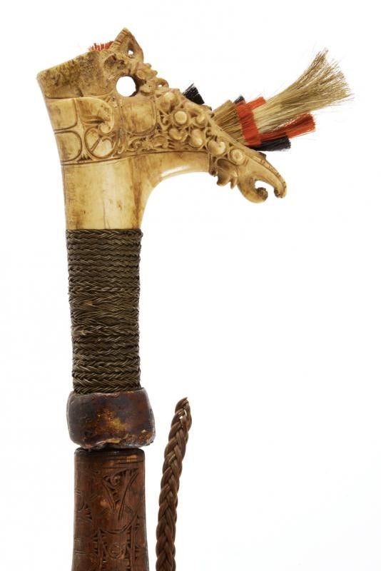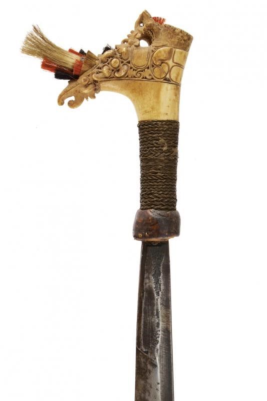 dating: 19th Century provenance: Borneo, Strong, slightly curved, single-edged blade. Typical, carved, bone hilt, decorated with coloured horsehair, the base with vegetable wire binding. Wooden scabbard (missing parts at the tip) partially carved with braided, vegetable fibre bands. length 59.5 cm.