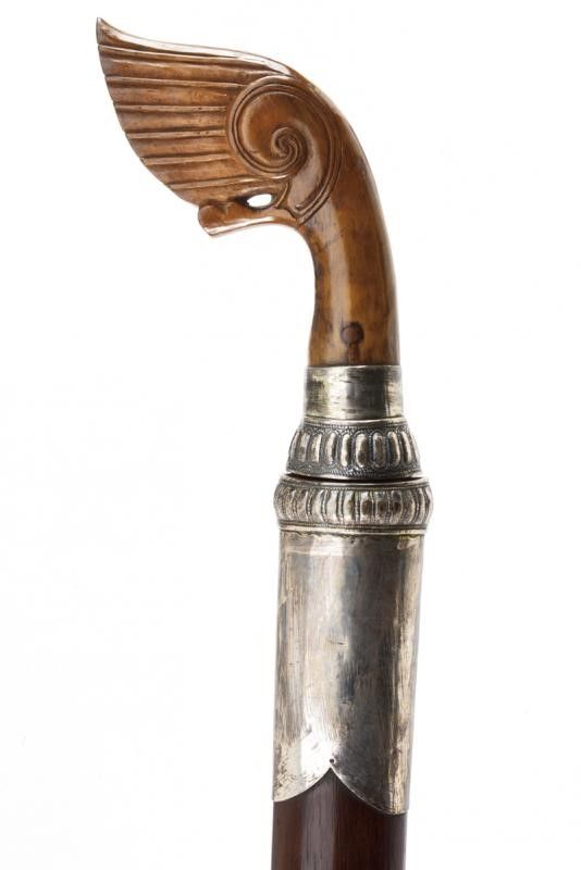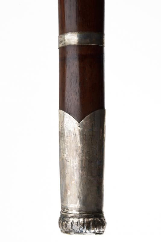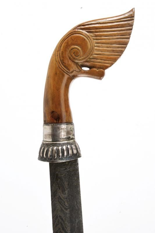 dating: early 20th Century provenance: Sumatra, Heavy, single-edged blade made of very fine pamor. Angled and sculpted wooden grip, the base with embossed, silver ring nut. Wooden scabbard with silver mounts. Good quality. length 70 cm.
