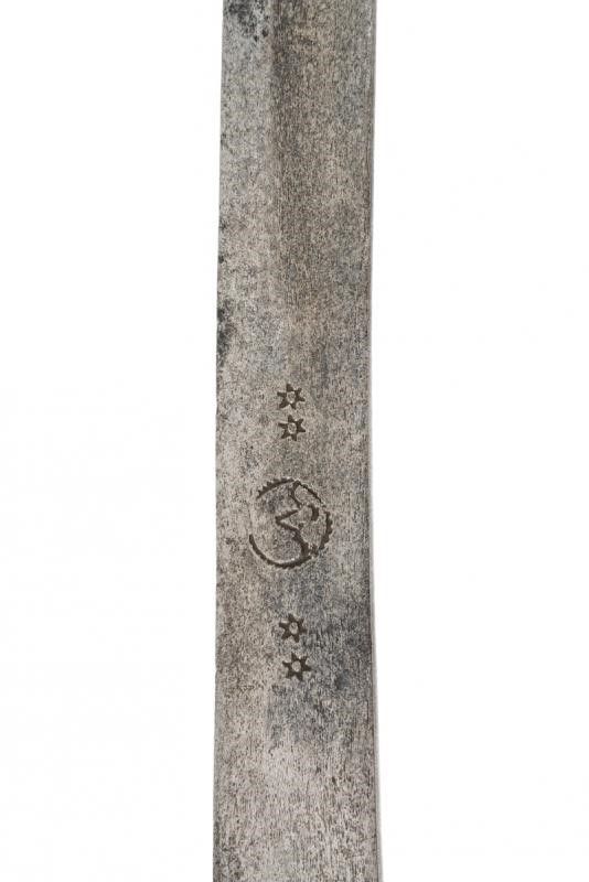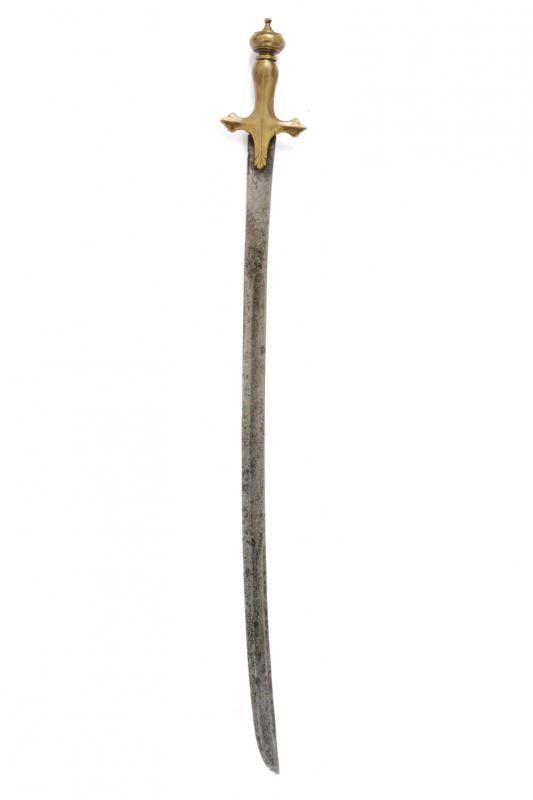 dating: 19th Century provenance: Sumatra, Curved, single-and false-edged blade with central fuller, flat base and with a mark among stars on both sides. Late 19th century, bronze hilt similar to the Indian tulwars' ones. The blade is more antique. length 87.8 cm.