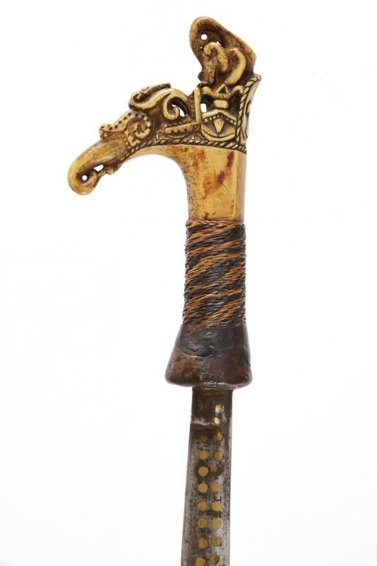 dating: 19th Century provenance: Kalimantan, Straight, single-edged blade decorated with brass inlays (missing parts), near the weak a series of fretwork at the back. Richly carved and pierced deer-horn hilt, the base covered with vegetable fibre. Fine wooden scabbard partially carved and grooved with horn edges, the back with scabbard for a knife. Suspension rope. Deer-horn pendant, carved with a stylized face. length 49.8 cm.