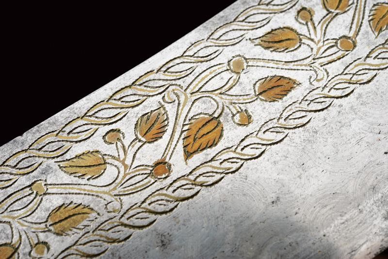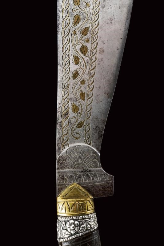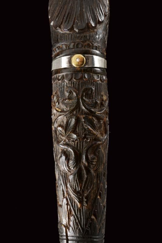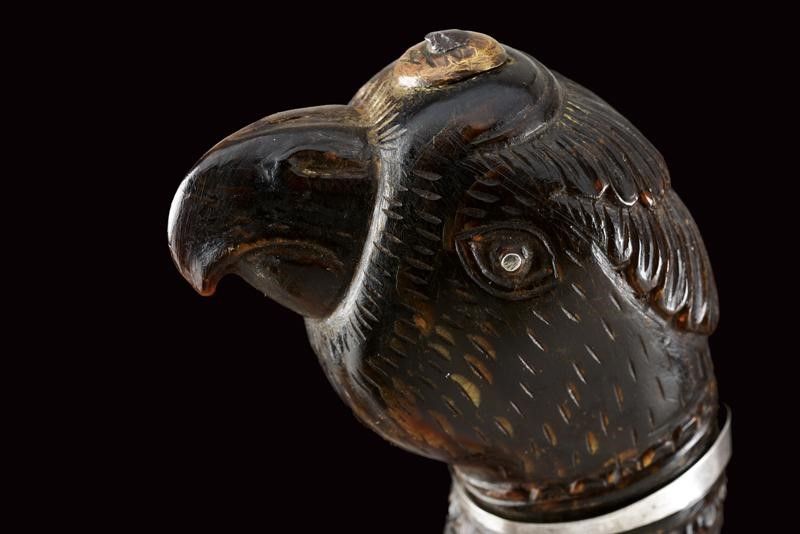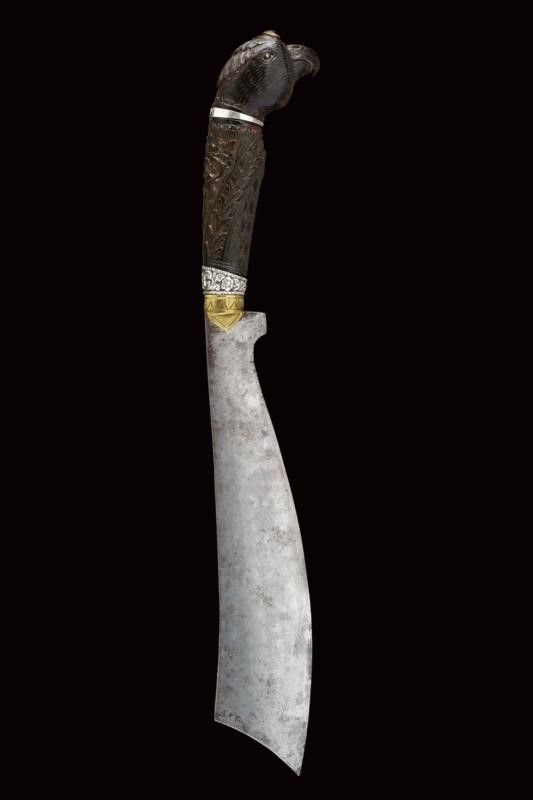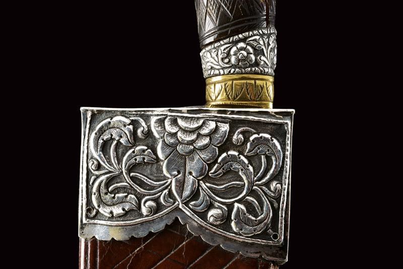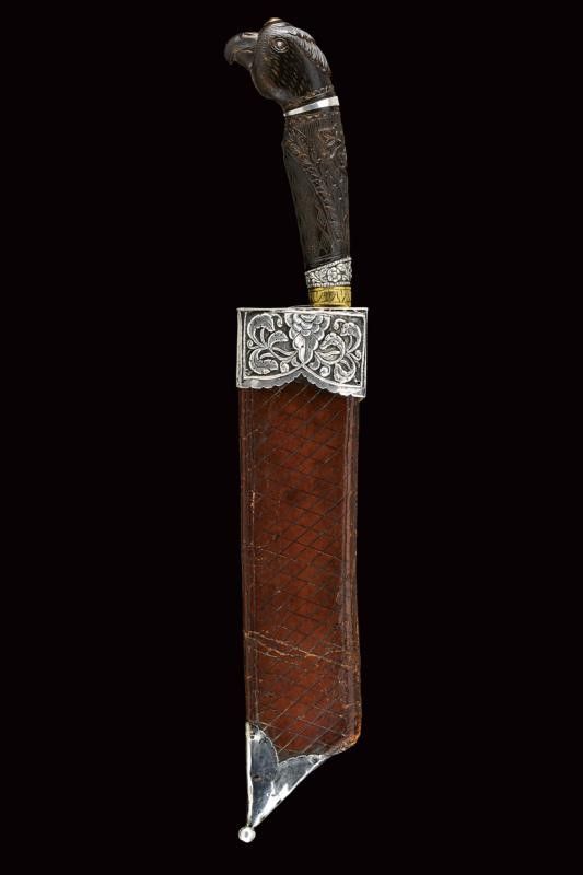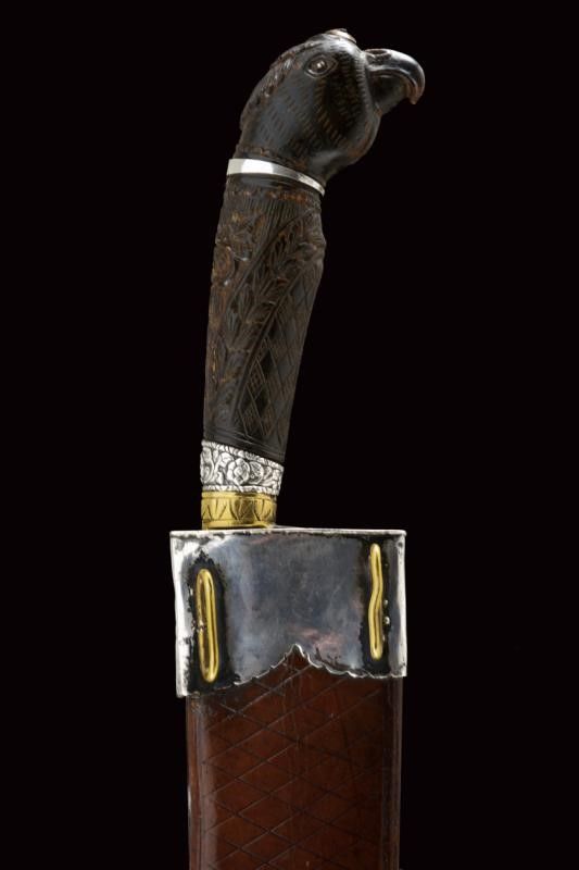 dating: Late 19th Century provenance: Mindanao, Large, single-edged blade rising towards the tip, richly engraved and brass-inlaid on one side. Horn grip majestically sculpted with a parrot's head, floral and geometrical motifs in bas-relief, parrot's head with silver eyes and collar. Leather scabbard with silver cap embossed with floral motifs (behind two brass loops) and smooth, silver chape. length 42 cm.