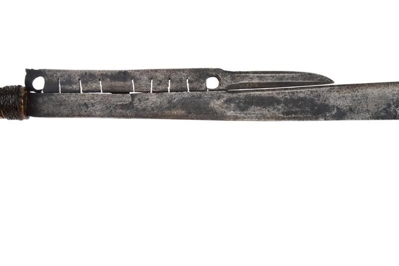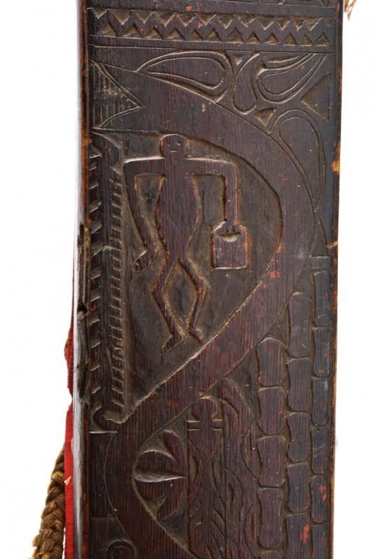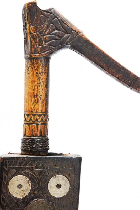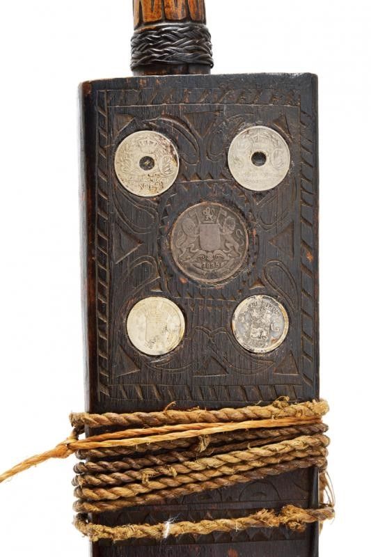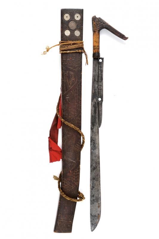 dating: End of 19th beginning of 20th Century provenance: Sarawak, Long, single-edged, machete-like blade, widening towards the weak, provided with a single-edged blade on one side; pierced and carved at the back. Small areas with rust damages. Triangular deer-horn hilt partially sculpted with geometric motifs. The base with a woven fiber band. Fine wooden scabbard; the front surface engraved with snake, anthropomorphic figure and geometric and floral decorations; the upper part decorated with five coins (the sixteenth missing) from different countries and eras (dated from 1835 to 1921). Remains of suspension rope. Very rare. length 78.5 cm.