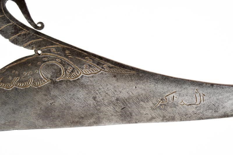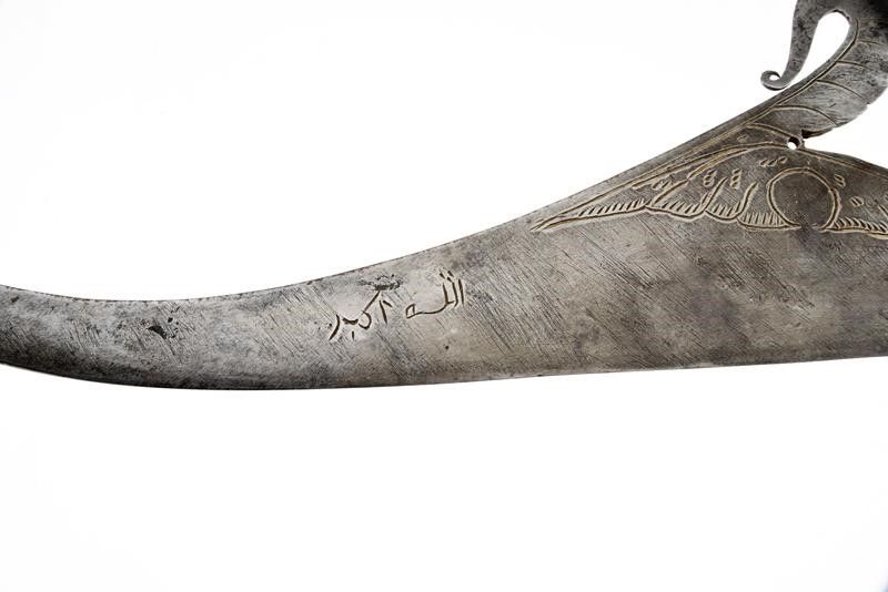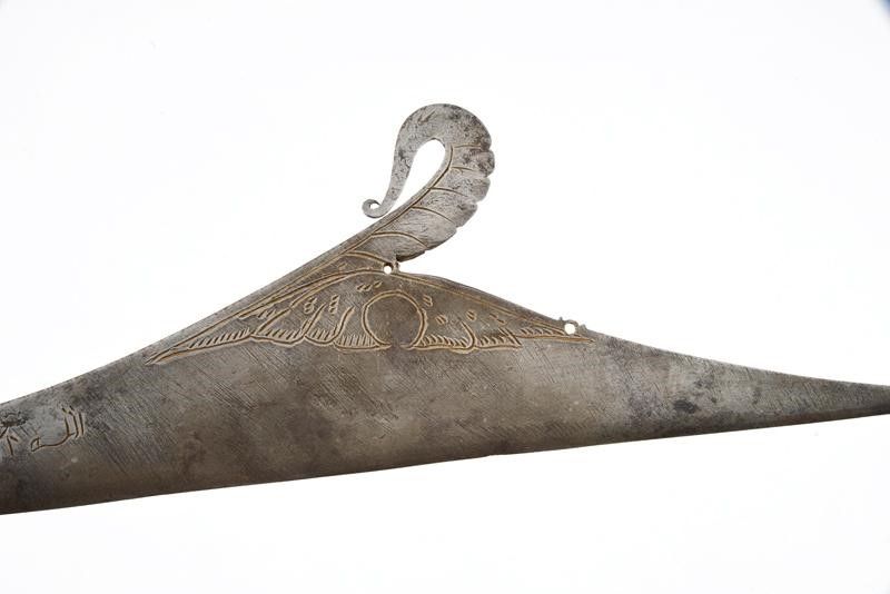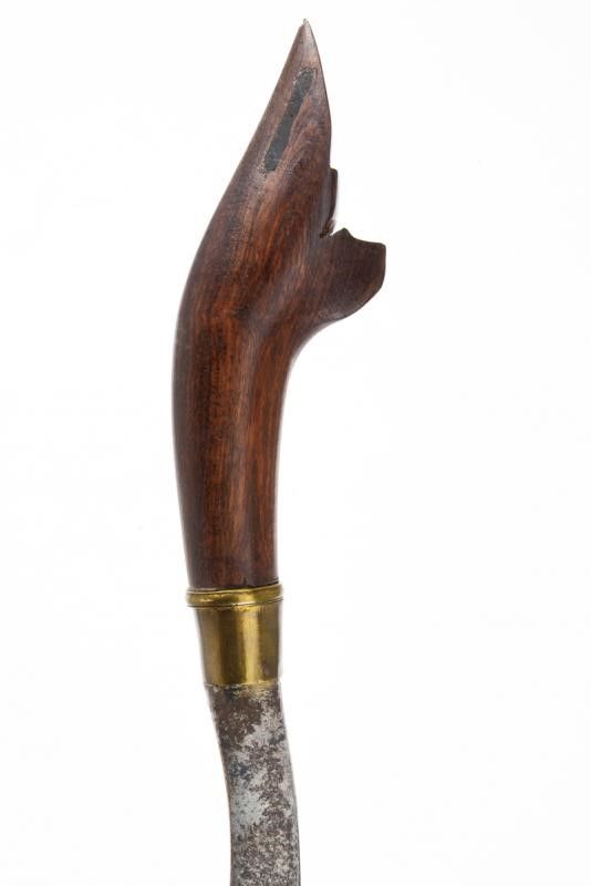 dating: 19th Century provenance: The Philippines, Interesting blade with straight edge, curved after the rectangular tang, triangular tip and featuring a big curl and engravings at the center, short inscriptions (?) on both sides. Sculpted, wooden grip with brass ring nut. Rare. length 59.9 cm.