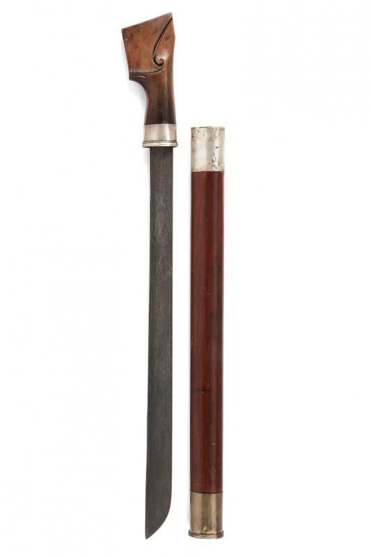 dating: 19th Century provenance: Makassar, Heavy, single-edged blade made of very beautiful pamor. Elegant, slightly sculpted and finely carved, wooden hilt, silver ring nut. Oval, wooden scabbard with silver-inlaid mounts. Rare. length 73 cm.