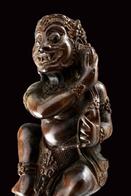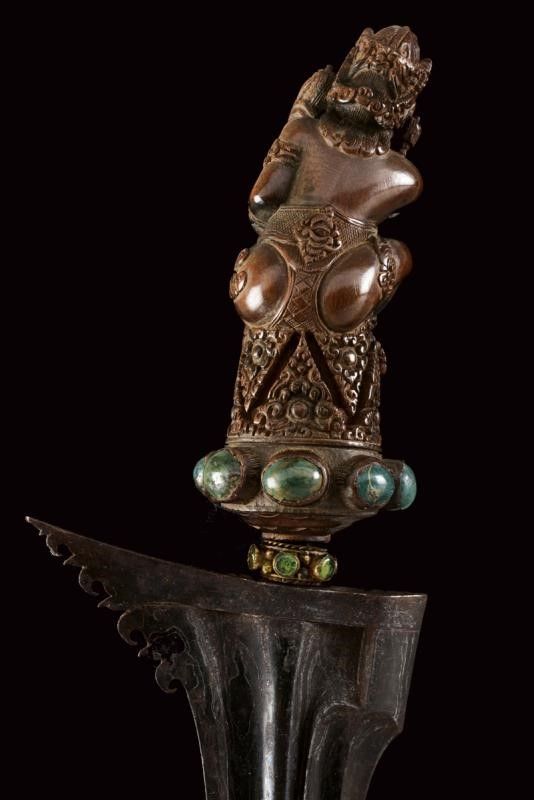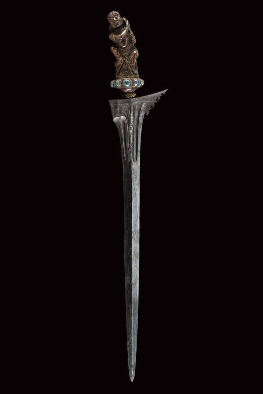dating: 19th/20th Century provenance: Bali, Massive, smooth, double-edged blade of lozenge section made of beautiful pamor, deeply carved at the base (19th century and earlier). Wooden ukiran, masterfully sculpted as a deity, the base with green cabochon stones. Metal mendak with colored stones. No scabbard. Of high quality. length 57 cm.