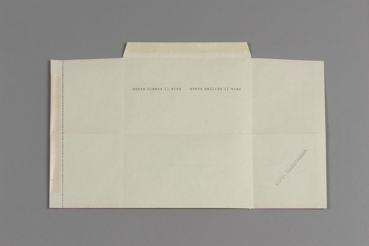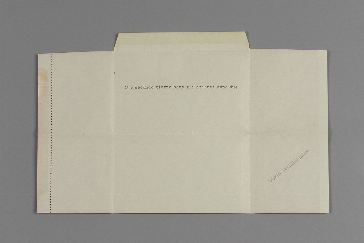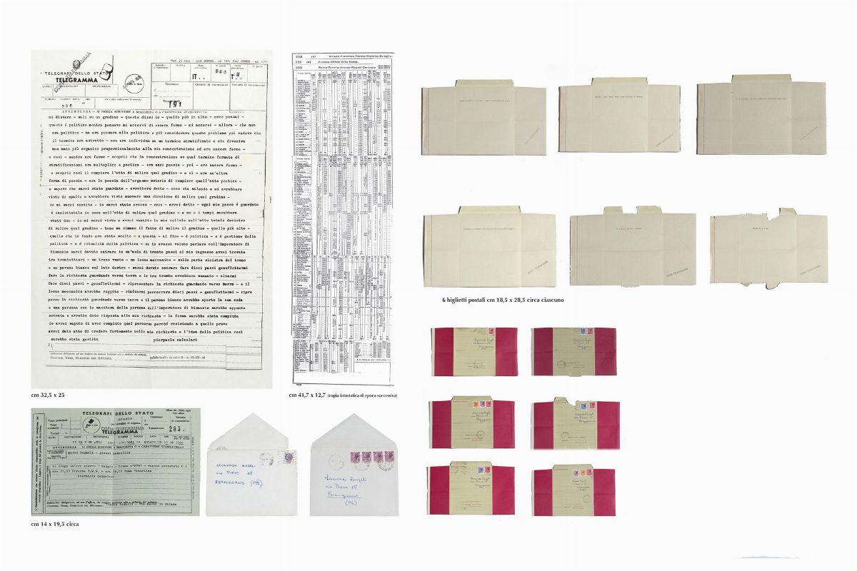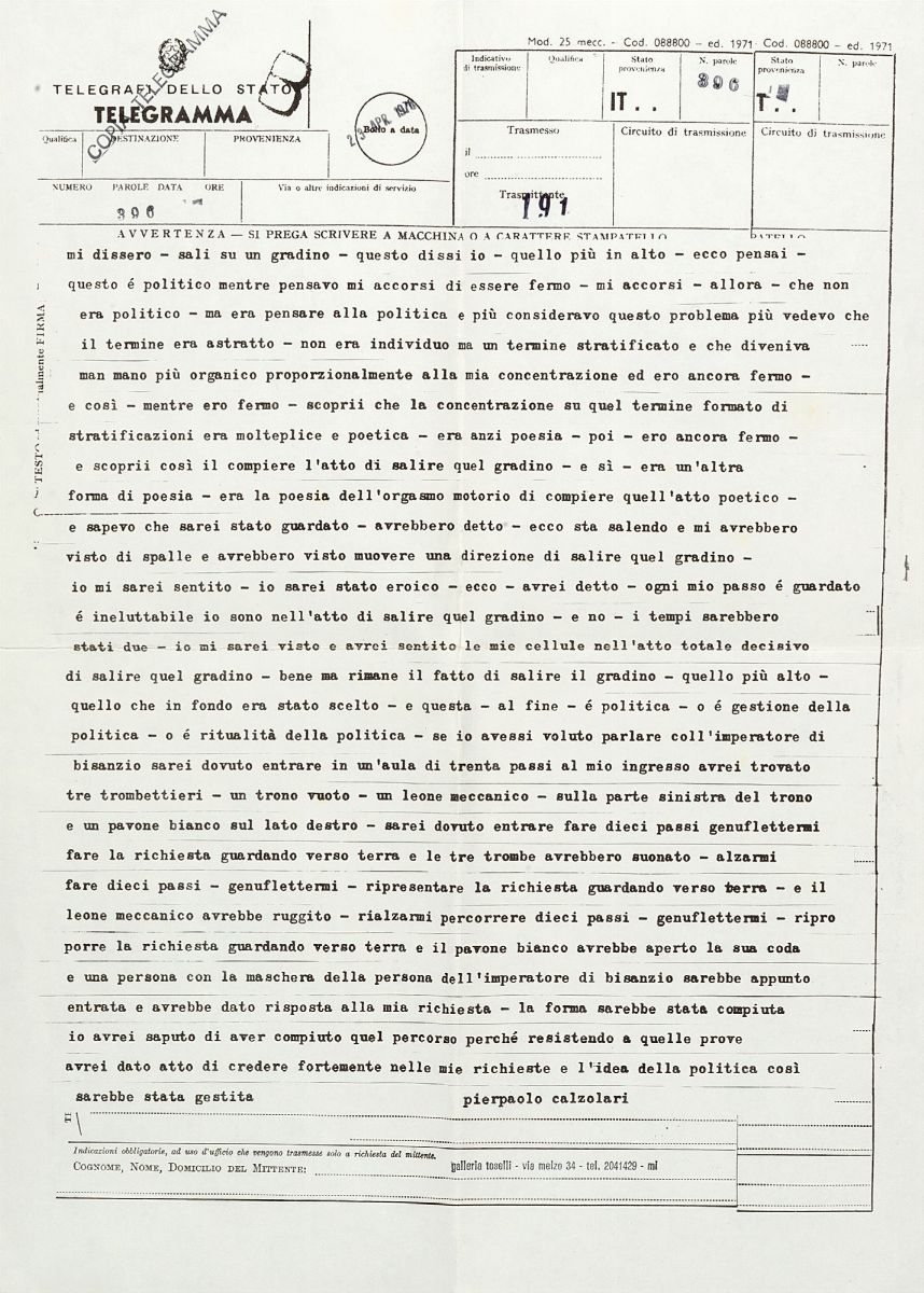 Pier Paolo Calzolari made the following work in April 1976. For 9 days he sent a telegram per day to 15 & nbsp; people. Copies of these 8 telegrams, plus & nbsp; copies of the railway timetable, were sent simultaneously to another 200 people. The railway timetable was sent to all people after the first telegram: a & nbsp; official table relating to the Milan - Nocera Inferiore line with some transit works marked in pencil. The last telegram was sent only to the two recipients, Marco Bagnoli and Jannis Kounellis. & Nbsp; On May 5, a railway train departed from Milan in the morning to Nocera Inferiore, in the province of Salerno, with a fully reserved and therefore completely empty wagon.