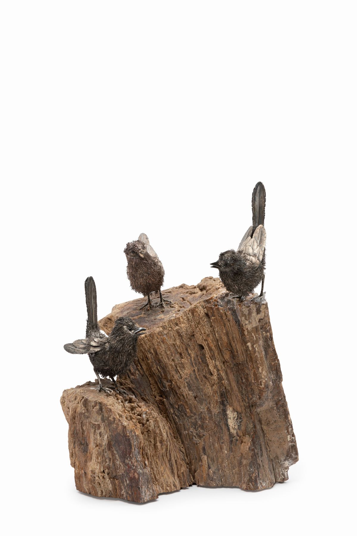 A sterling silver sculpture depicting three sparrows on mineral support, Italy, 20th Century