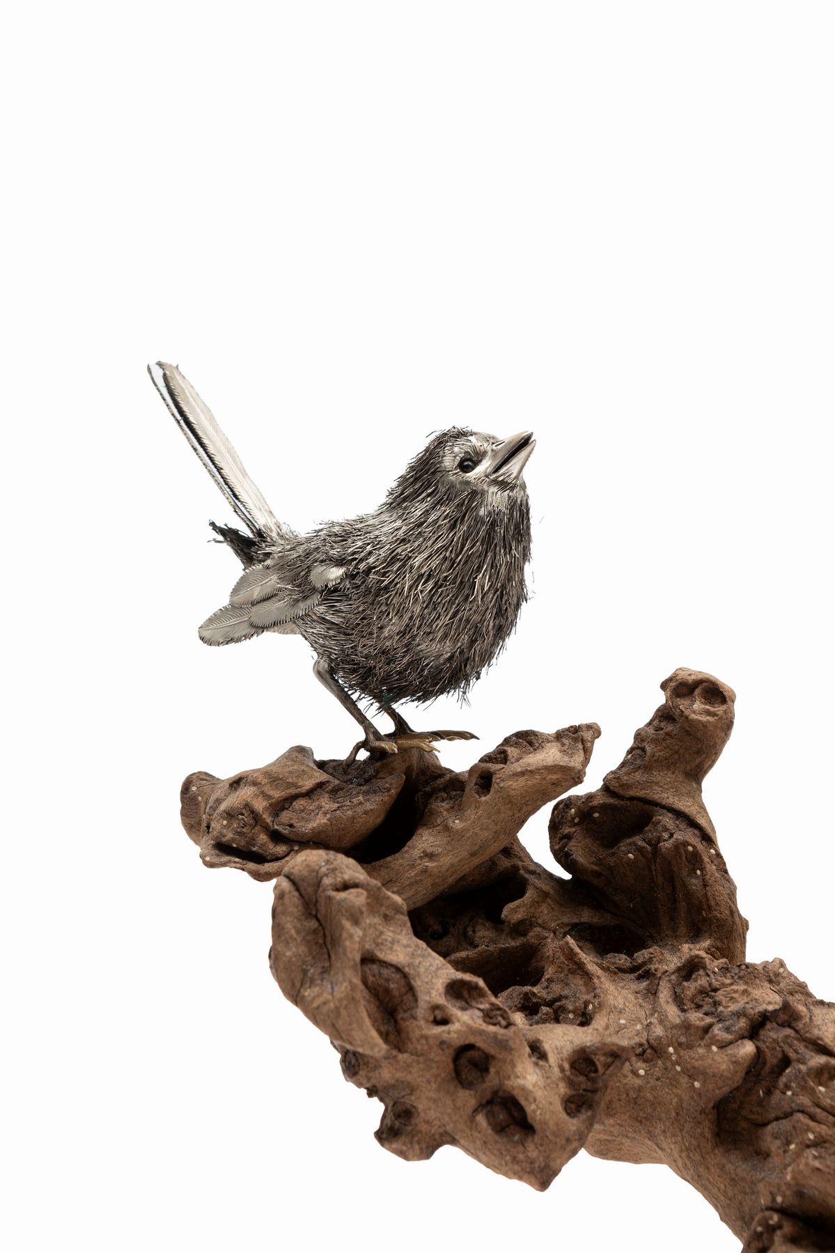 A sterling silver sculpture of three sparrows on a branch, Italy, 20th Century