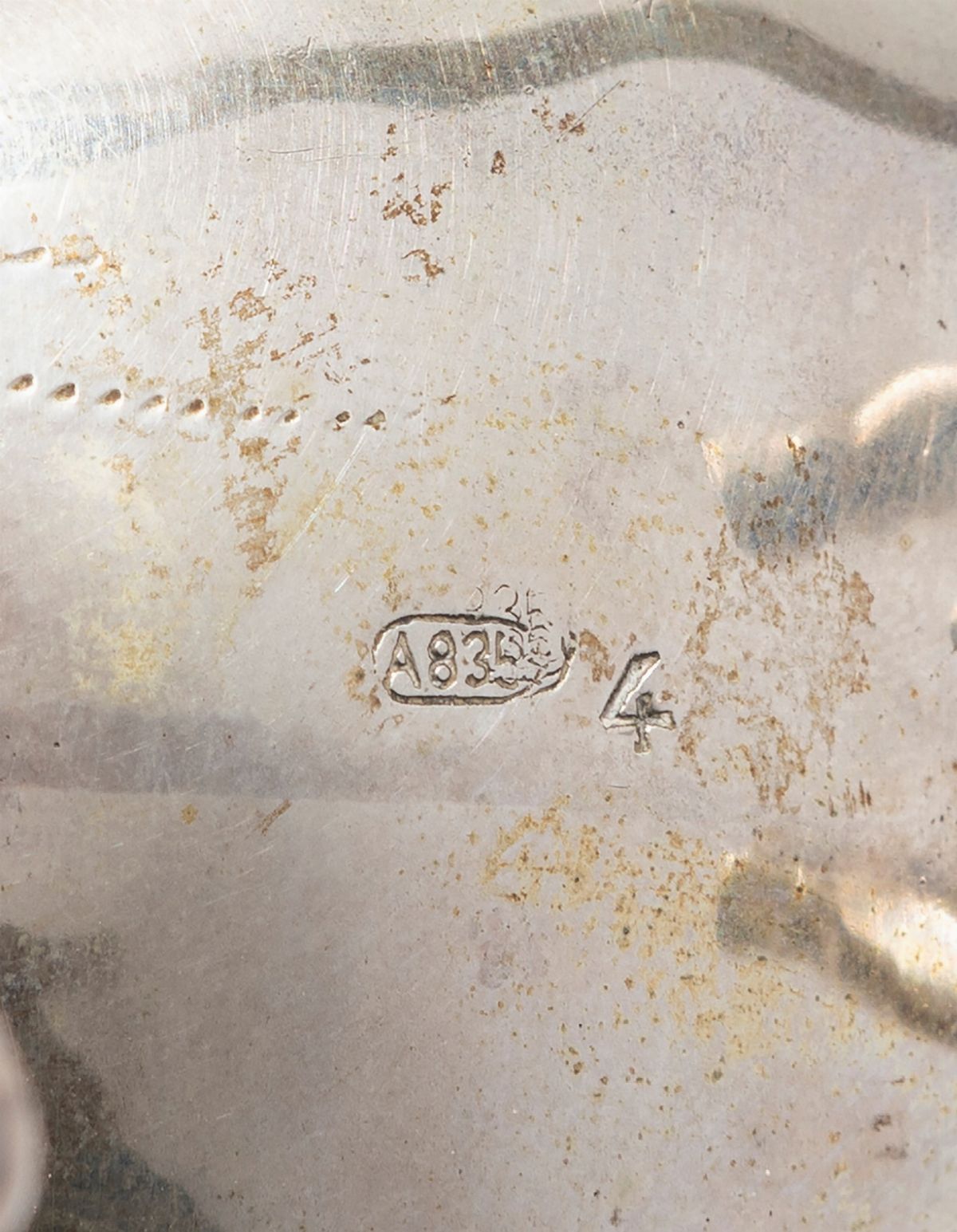 in argentosmooth body with engraved coat of arms and cow-shaped milk jug, defects (visible dents).