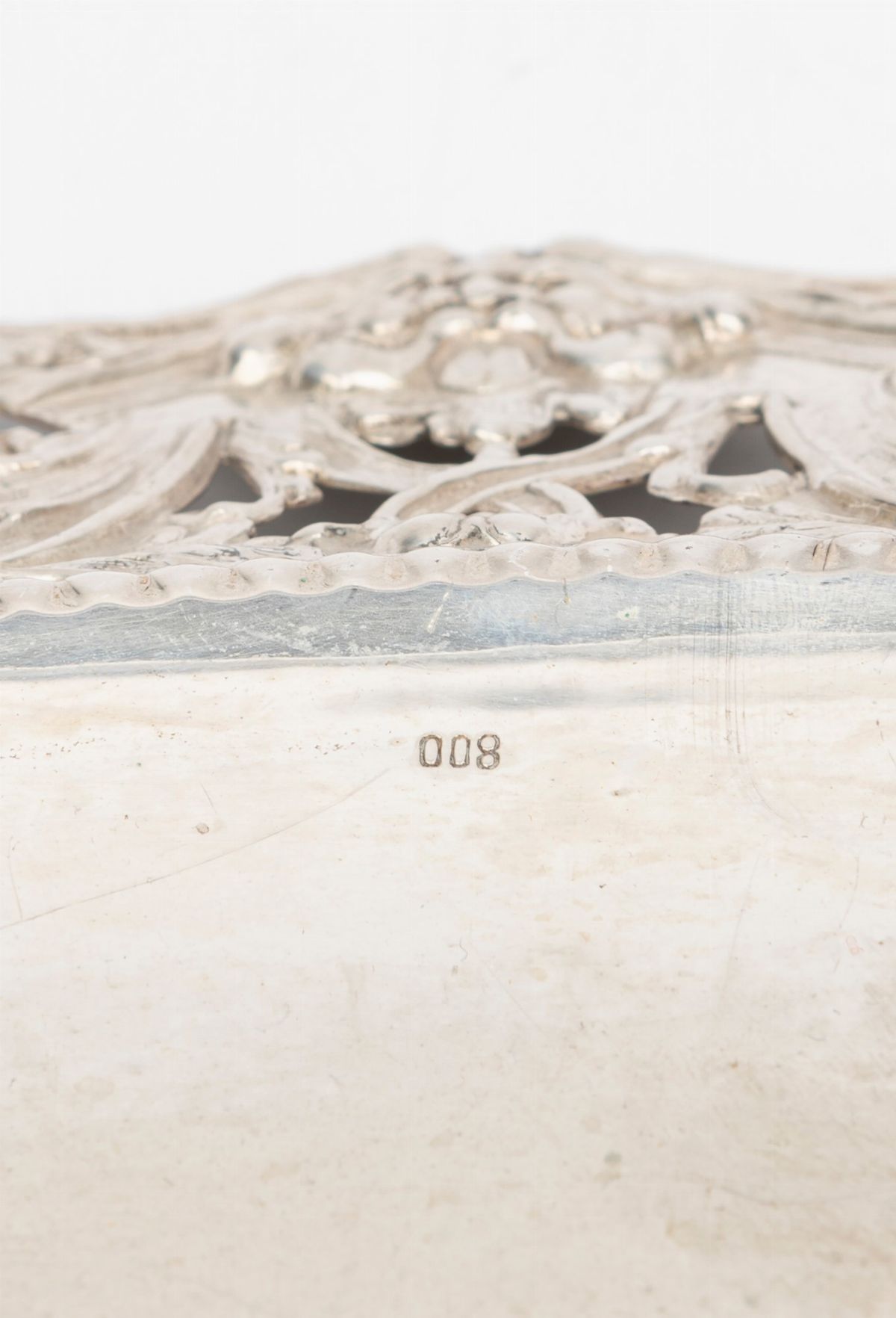 in argentoone resting on four feet with a perforated edge with scrolls and cherubs; one with a polylobed shape and a vegetal profile.