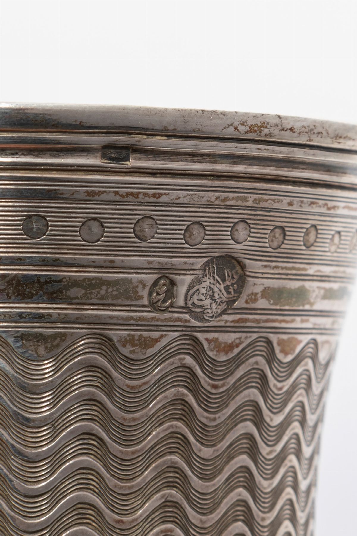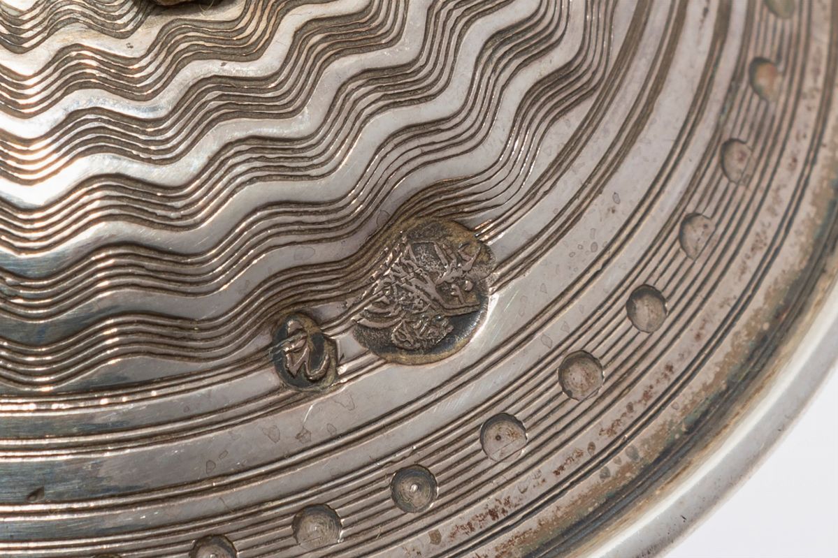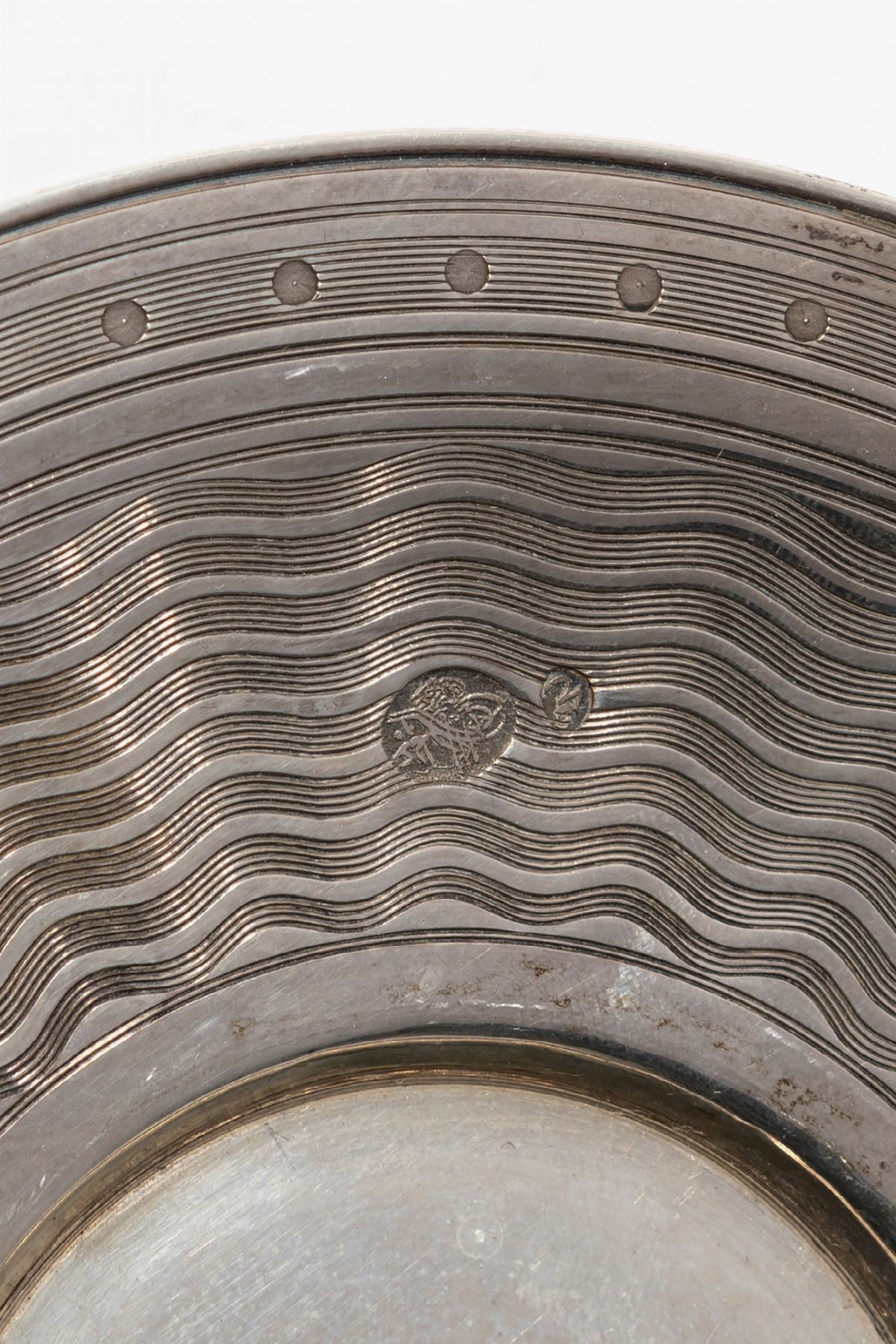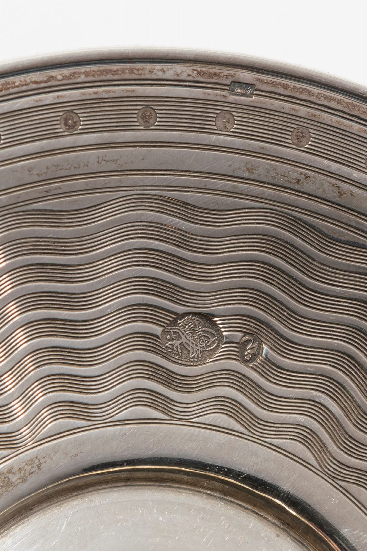 in argentocups with lids with floral grip and vermeil interior, saucers with engraved decorations, a spoon.