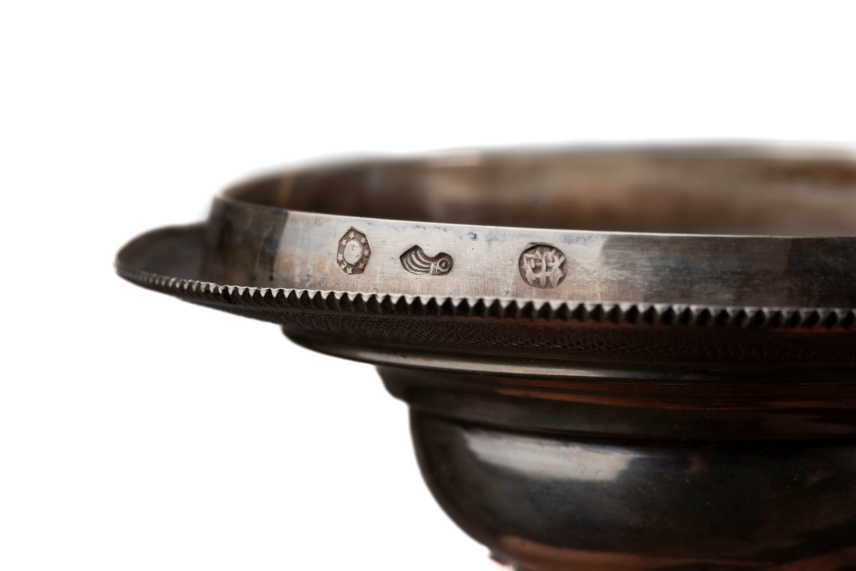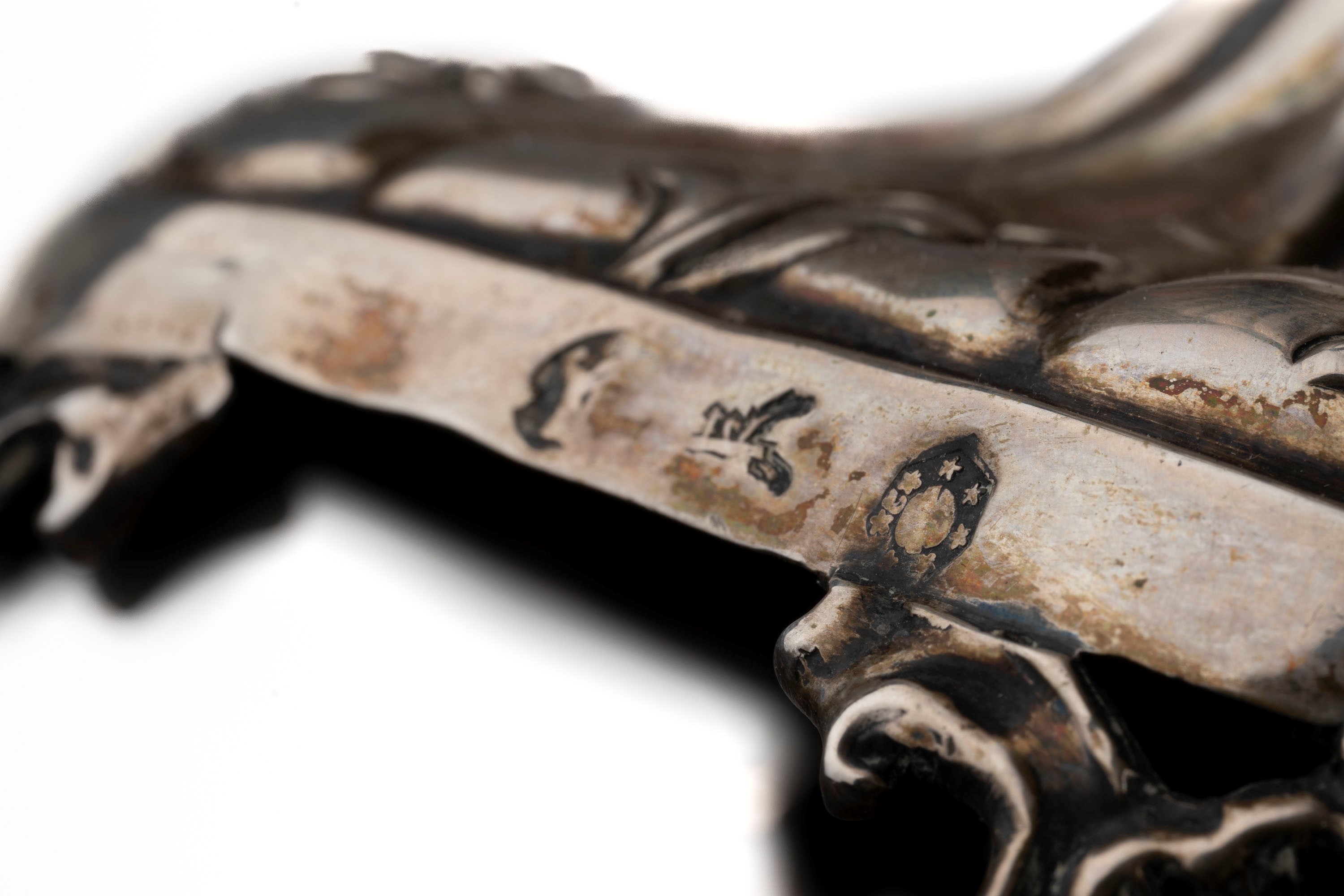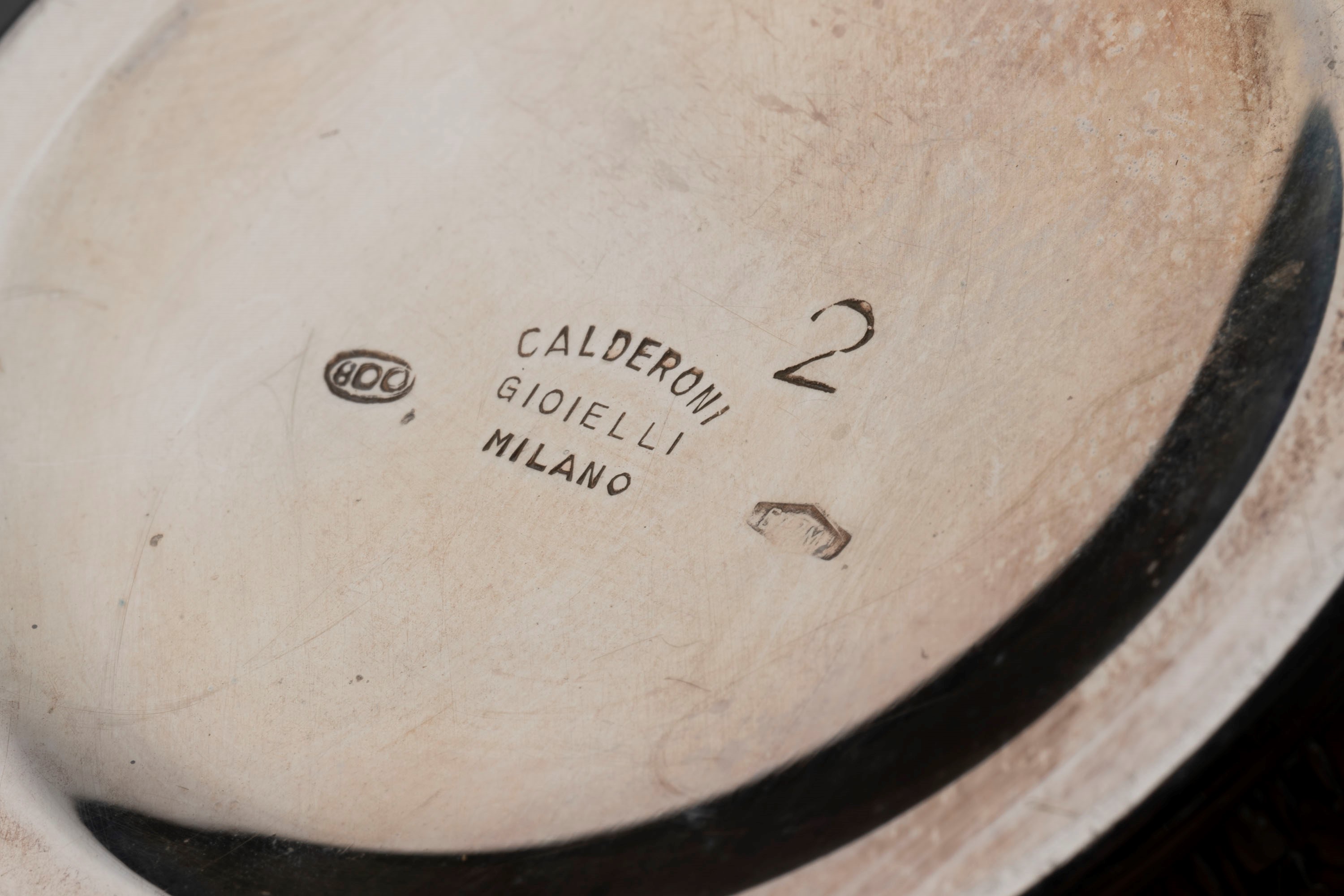in argentoshaker firmato Calderoni, a corpo liscio con decori in stile impero, coppa poggiante su quattro piedini a conchiglia e decori a foglia, fusto baccellato e prese a ricciolo, zuccheriera poggiante su tre piedini zoomorfi con decori a bulino e presa a gallo.