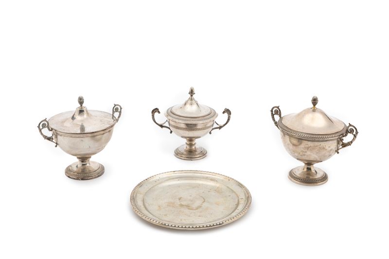 Three silver sugar bowls and a saucer, Italy, 20th century