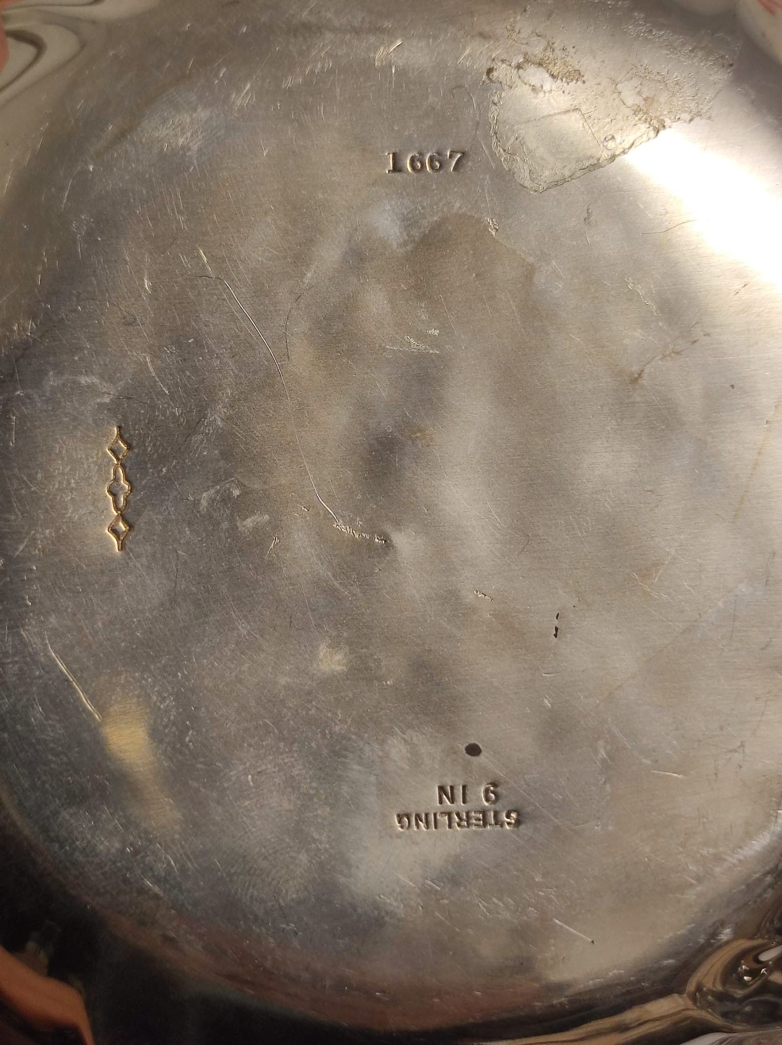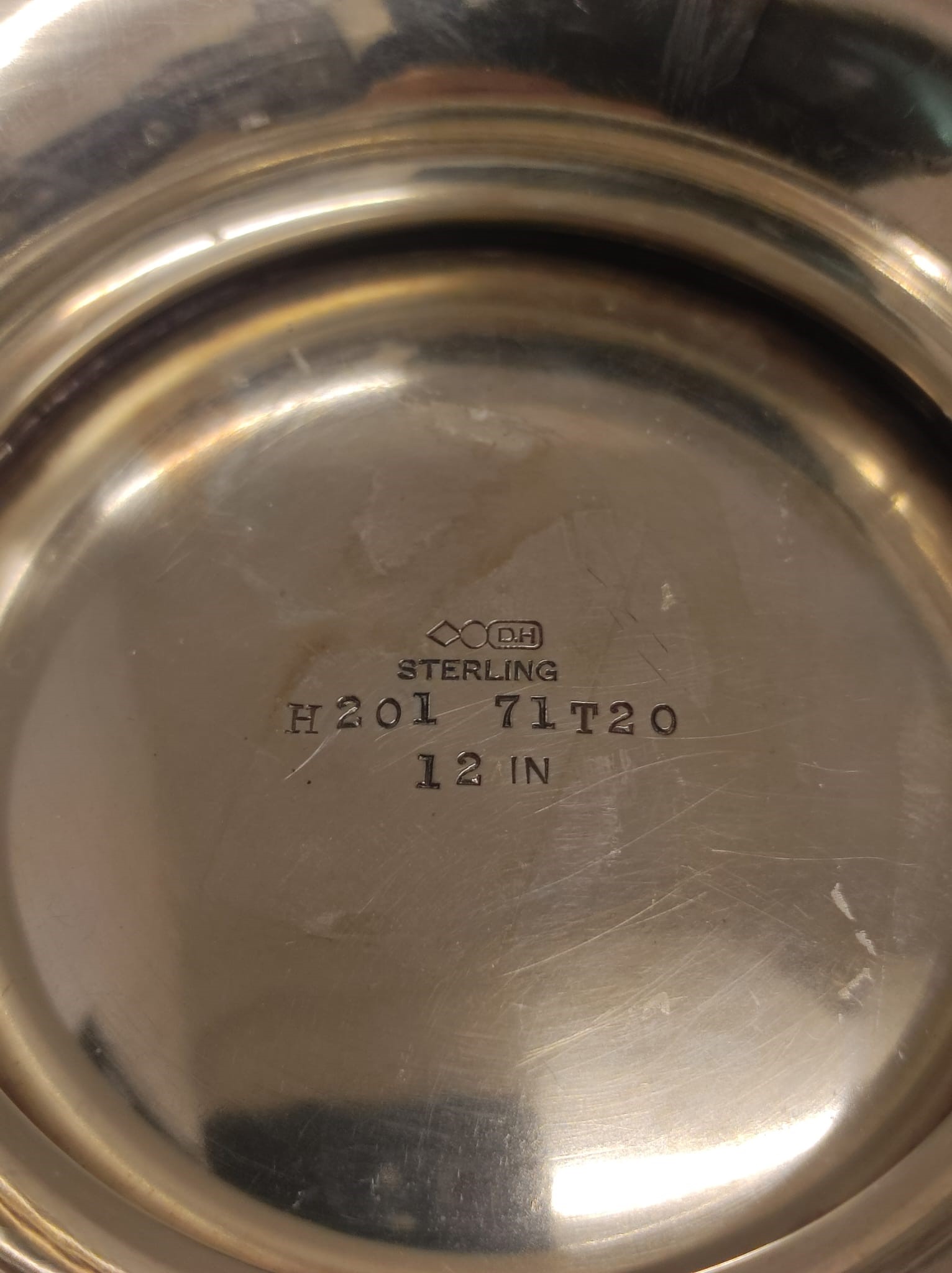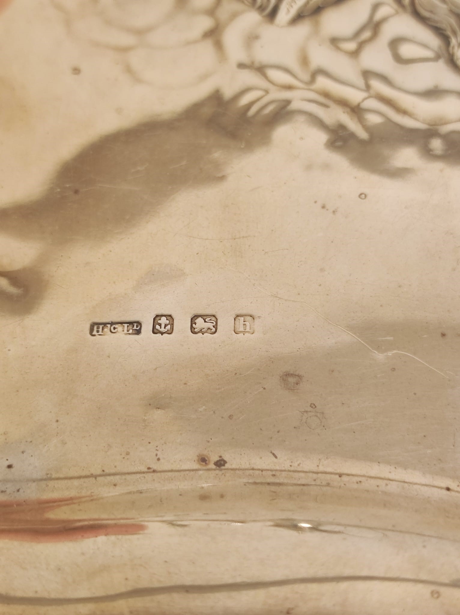 in argento sterlinga stand with a round shaped edge, a centerpiece with an embossed edge, a tray with little angels in relief, defects (some dents).